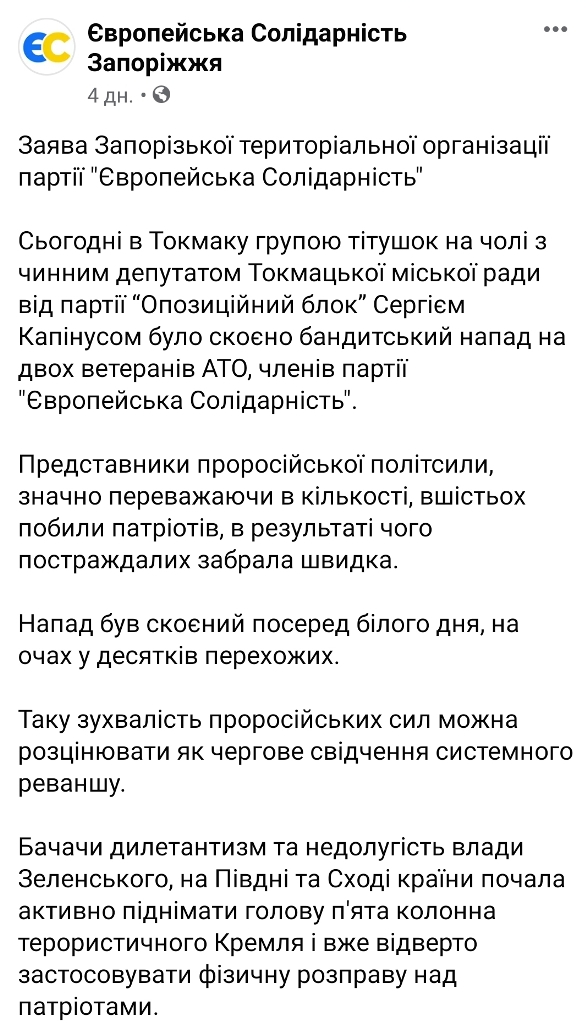 31 серпня Запорізька територіальна організація партії «Європейська Солідарність» виступила із заявою, що цього дня в місті Токмак відбулося побиття членів цієї партії, ветеранів АТО. Відповідно до інформації у викладеному допису напад відбувся за організації депутатом Токмацької міської ради від партії «Опозиційний блок» Сергієм Капінусом.