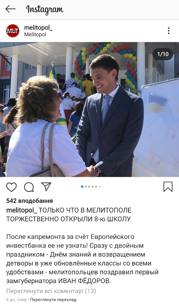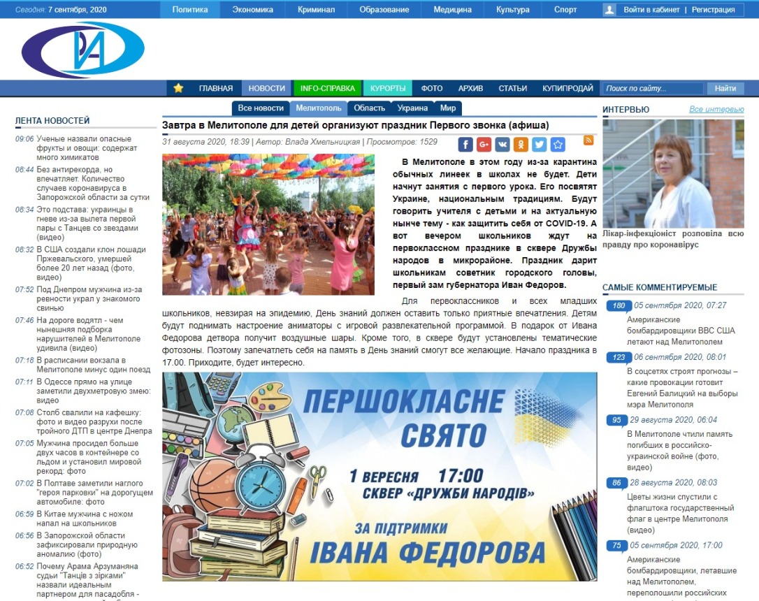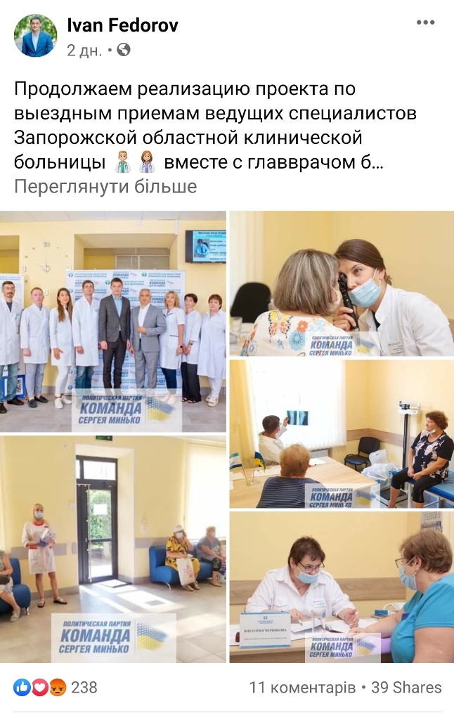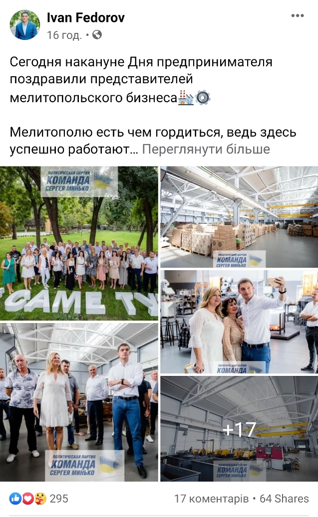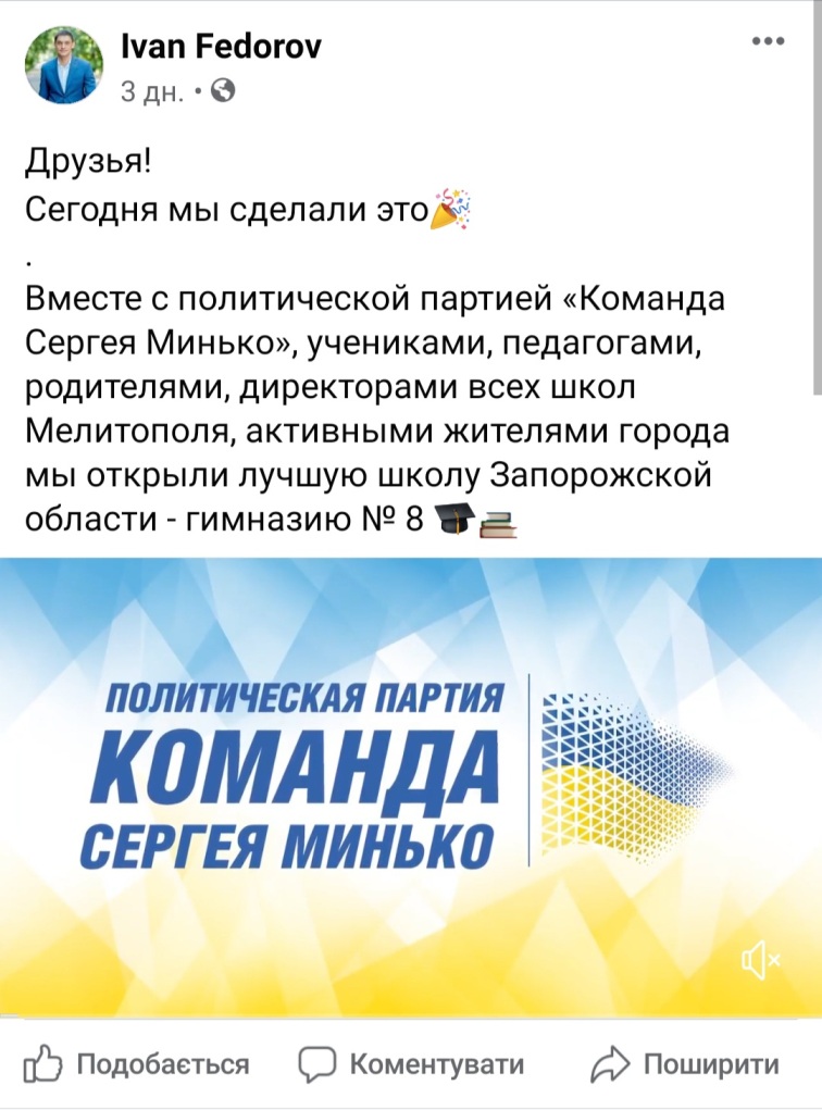 З 1 по 4 вересня перший заступник голови Запорізької обласної державної адміністрації Іван Федоров розмістив на своїй сторінці низку дописів. В них із візуальним маркуванням чи прямою згадкою політичної партії «Команда Мінька» розповідається про відкриття гімназії №8 у Мелітополі (захід за участі політика проанонсував портал «РИА Мелитополь» та висвітлив один з місцевих каналів в Instagram), реалізацію проекту із виїзними прийомами фахівців Запорізької обласної клінічної лікарні, висловлюється привітання до Дня підприємця.