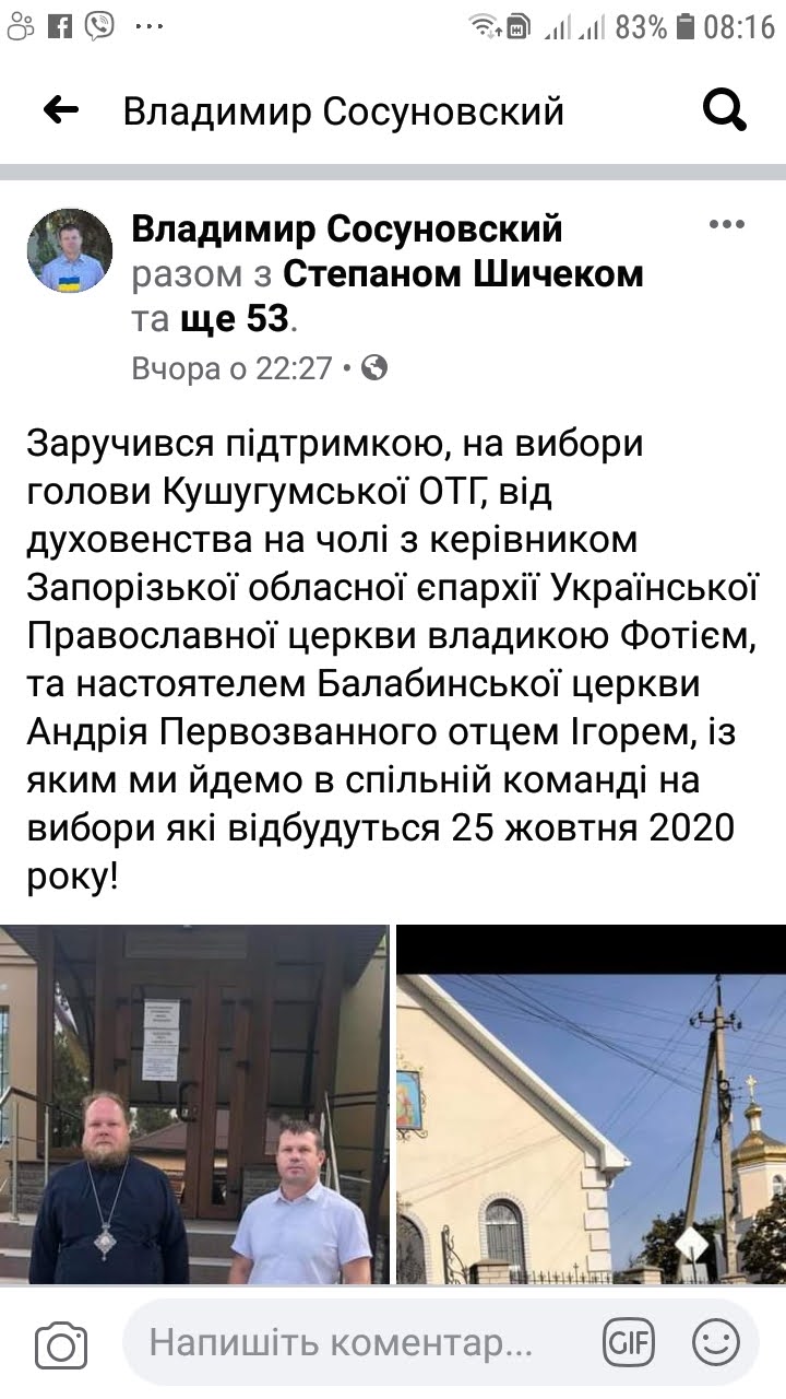 3 вересня Володимир Сосуновський сповістив, що отримав благословення на вибори голови Кушугумської ОТГ, від духовенства на чолі з керівником Запорізької обласної єпархії Української Православної церкви владикою Фотієм, та настоятелем Балабинської церкви Андрія Первозванного отцем Ігорем.