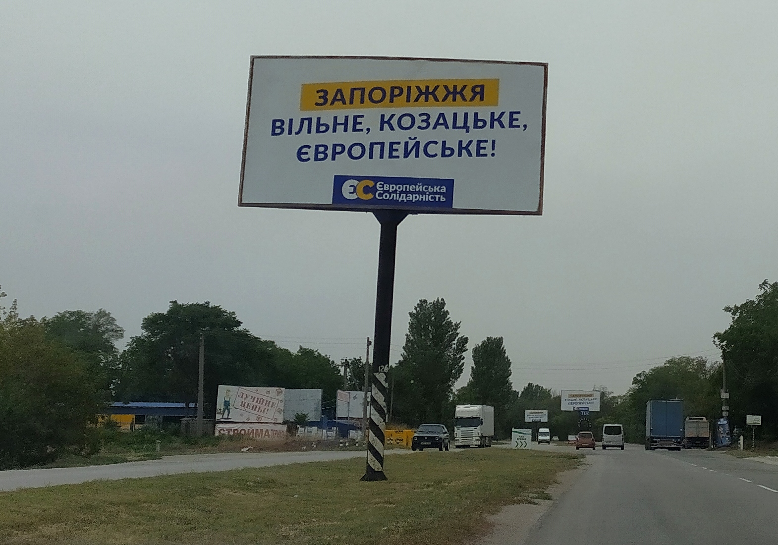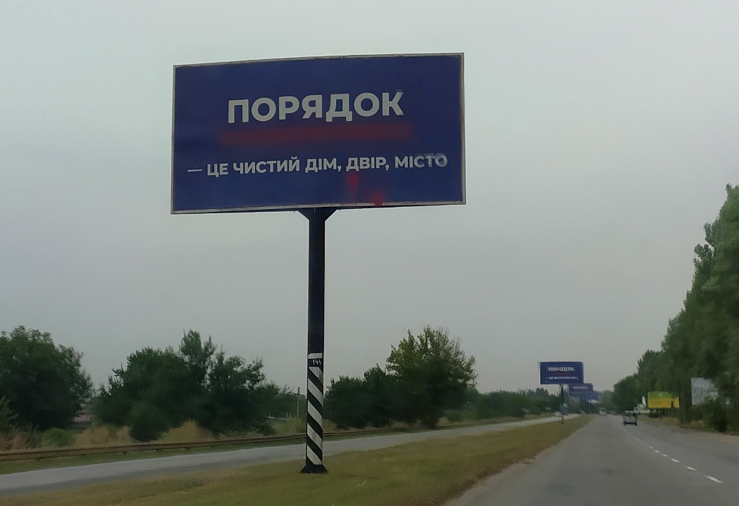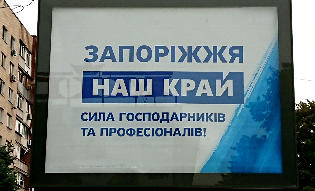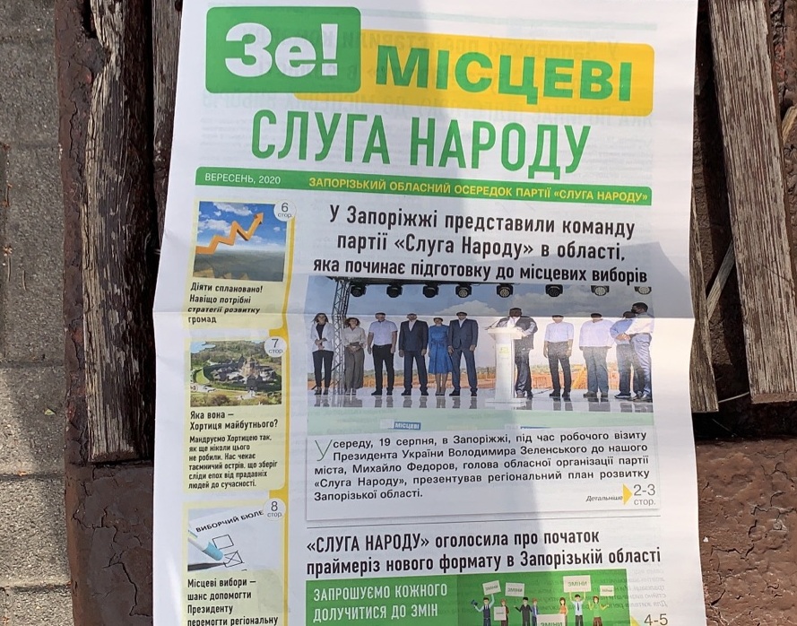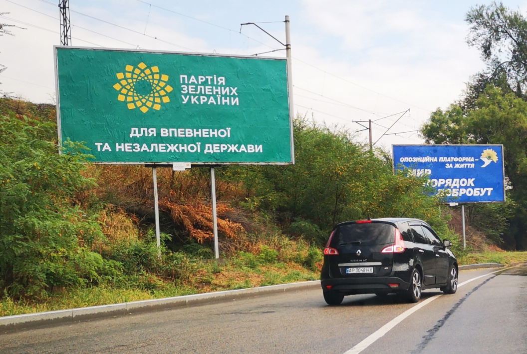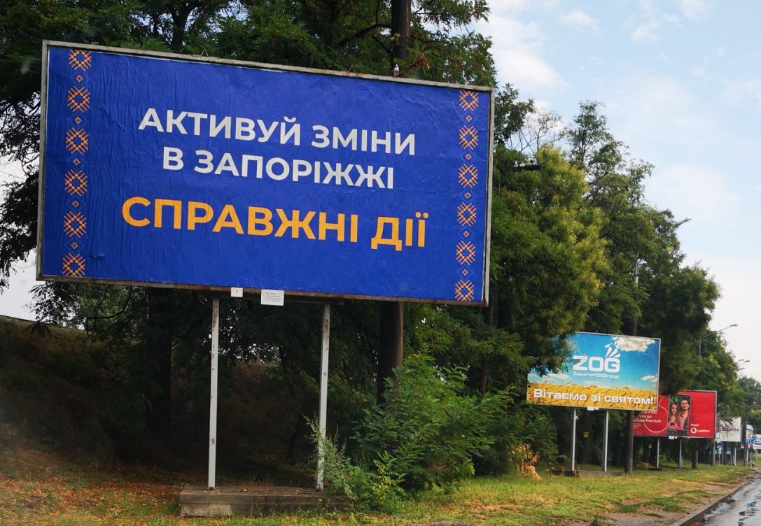 Окрім зовнішньої реклами від політичних партій «Наш край», «Опозиційна платформа – За життя», «Перемога Пальчевського», «Європейська Солідарність», «Батьківщина», «За майбутнє», «Слуга народу», які фіксувалися по області в другій половині серпня – тепер були помічені борди «Партії зелених України» та «Справжні дії», а також матеріали зі словом «Порядок» та кольорами й шрифтами подібними до тих, що використовує однойменна партія. В Мелітополі зустрічаються борди політпартії «Команда Мінька».