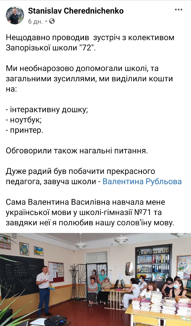 Депутат Запорізької обласної ради Станіслав Чередніченко виклав у соціальній мережі допис про свою зустріч із колективом Запорізької школи №72. В ньому він зазначив: «Ми неодноразово допомагали школі, та загальними зусиллями, ми виділили кошти на інтерактивну дошку; ноутбук; принтер».
