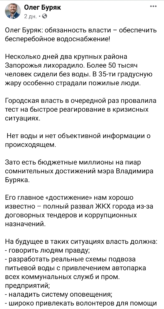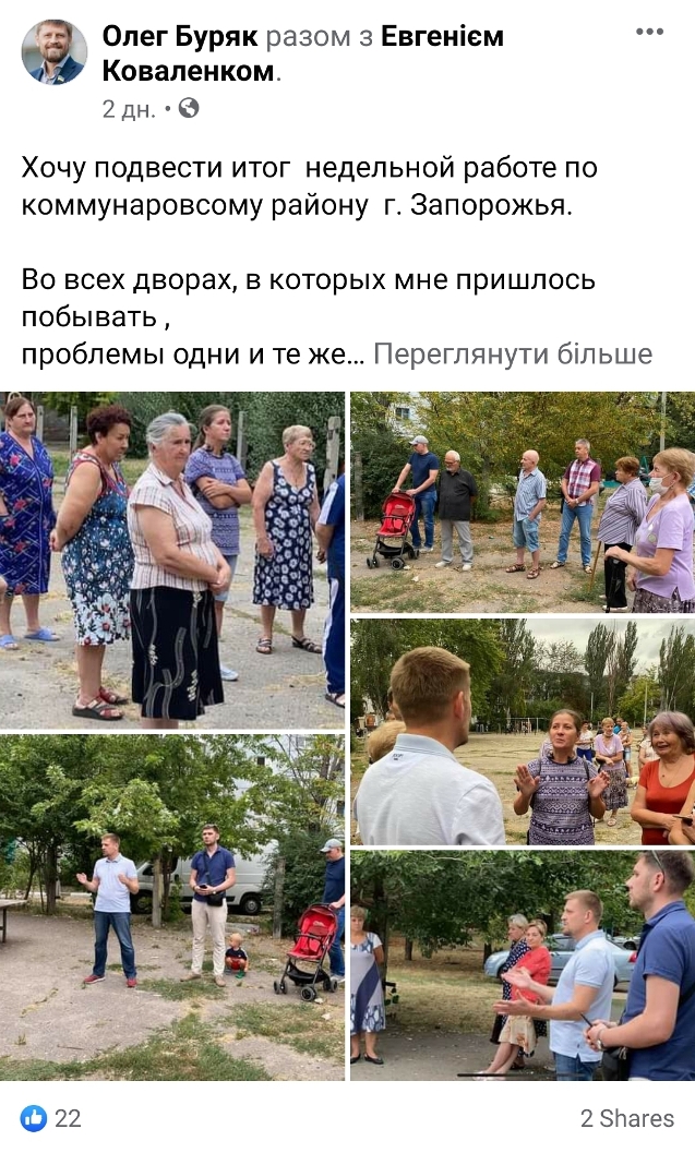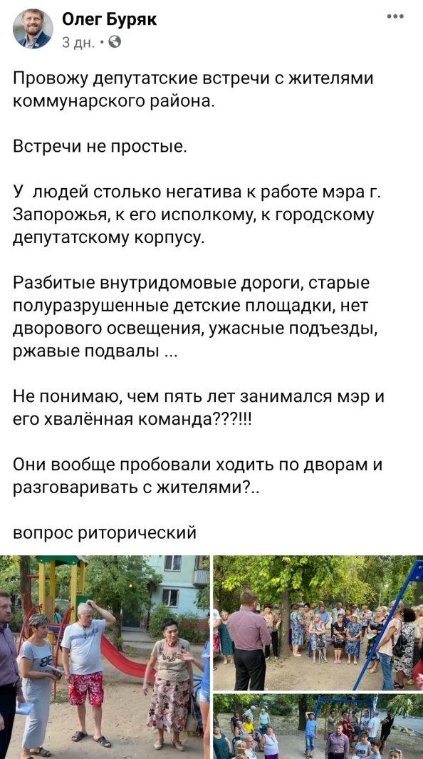 Депутат Запорізької обласної ради Олег Буряк виклав кілька дописів про свої зустрічі із мешканцями Комунарівського району у Запоріжжі та висловив критику на адресу чинного міського голови Володимира Буряка.