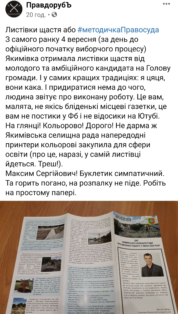 В спільноті присвяченій життю в Якимівській селищній раді виклали допис про те, що 4 вересня серед місцевих мешканців поширили брошури зі звітом сільради про виконані роботи у липні 2020 року. Матеріал містив світлину і звернення від секретаря сільради Максима Забари.