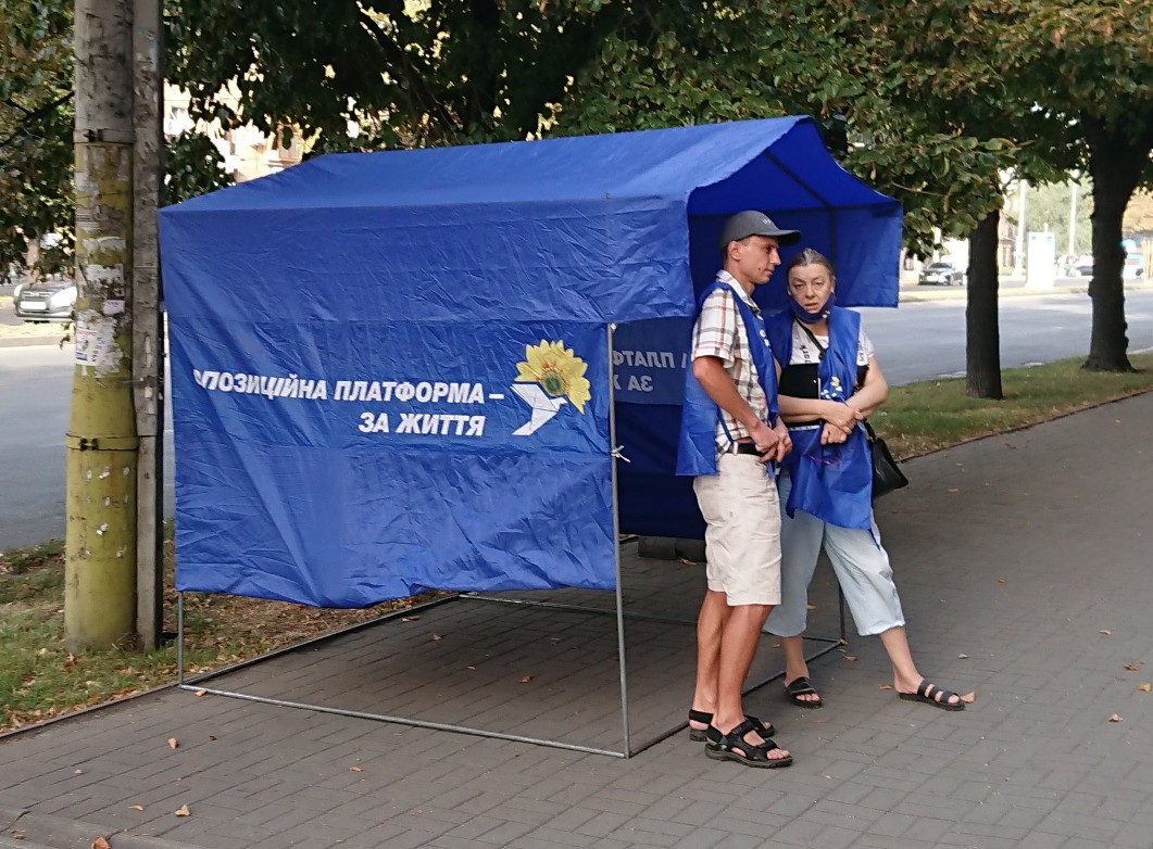 У Запоріжжі та інших районних центрах встановлені намети від партії «Опозиційна платформа – За життя», де триває опитування громадян з теми проведення місцевих виборів на підконтрольній Україні території Луганщини та Донеччини. На вулицях поширюються газети «Слуга народу».