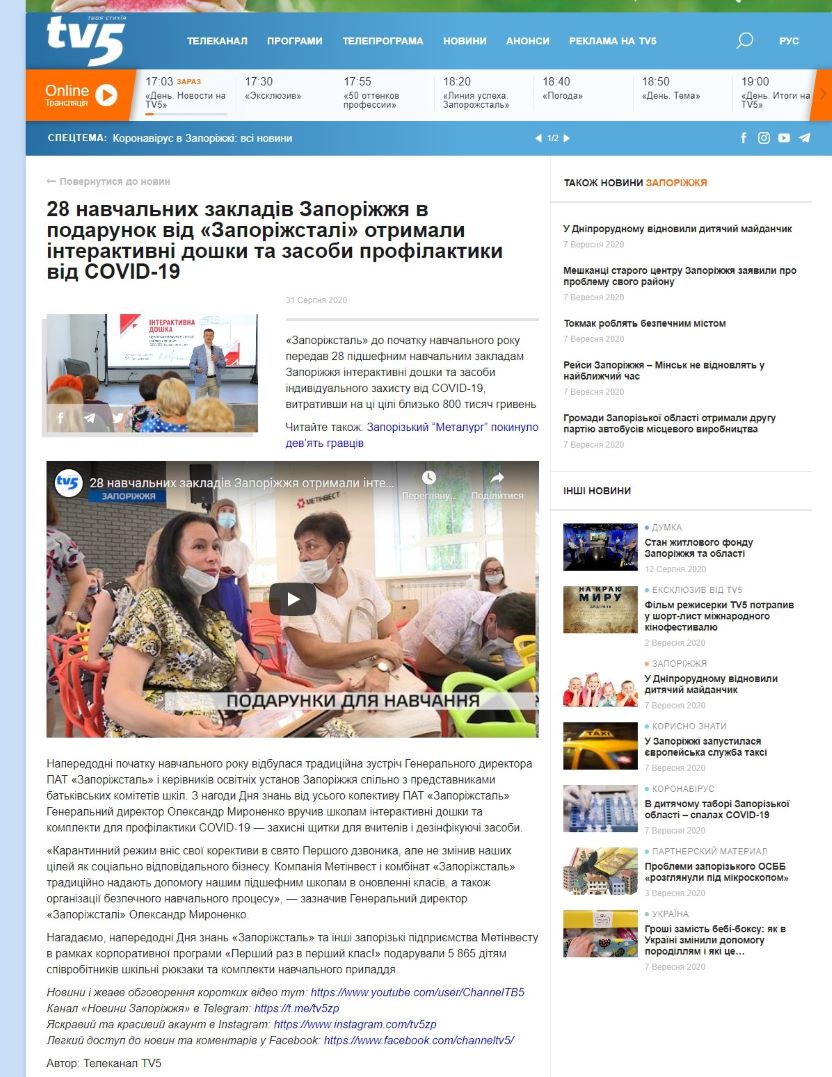 31 серпня телеканал «TV5» випустив ряд сюжетів із ознаками політичної реклами. Три з них (1, 2, 3) розповідали про допомогу представників партії «Порядок» мешканцям міст Запоріжжя, Дніпрорудного і села Біленького. Ще один висвітлював захід, де директор комбінату «Запоріжсталь» Олександр Мироненко ділився інформацією проте, що його підприємство надало в подарунок 28 навчальним закладам Запоріжжя інтерактивні дошки та засоби профілактики від COVID-19.