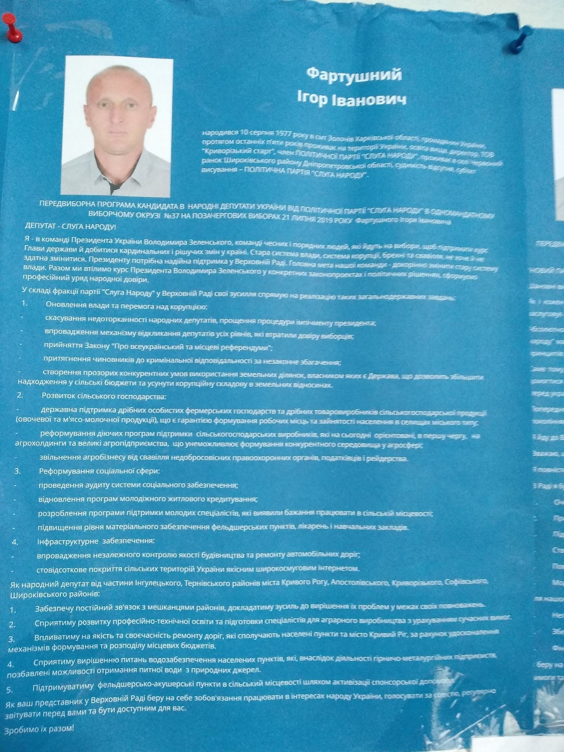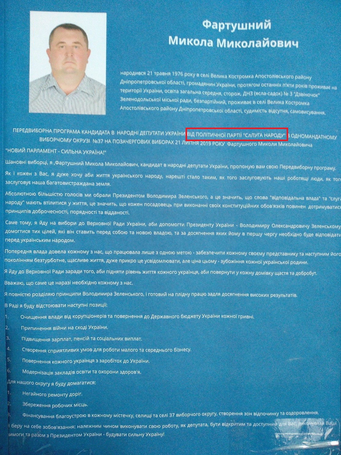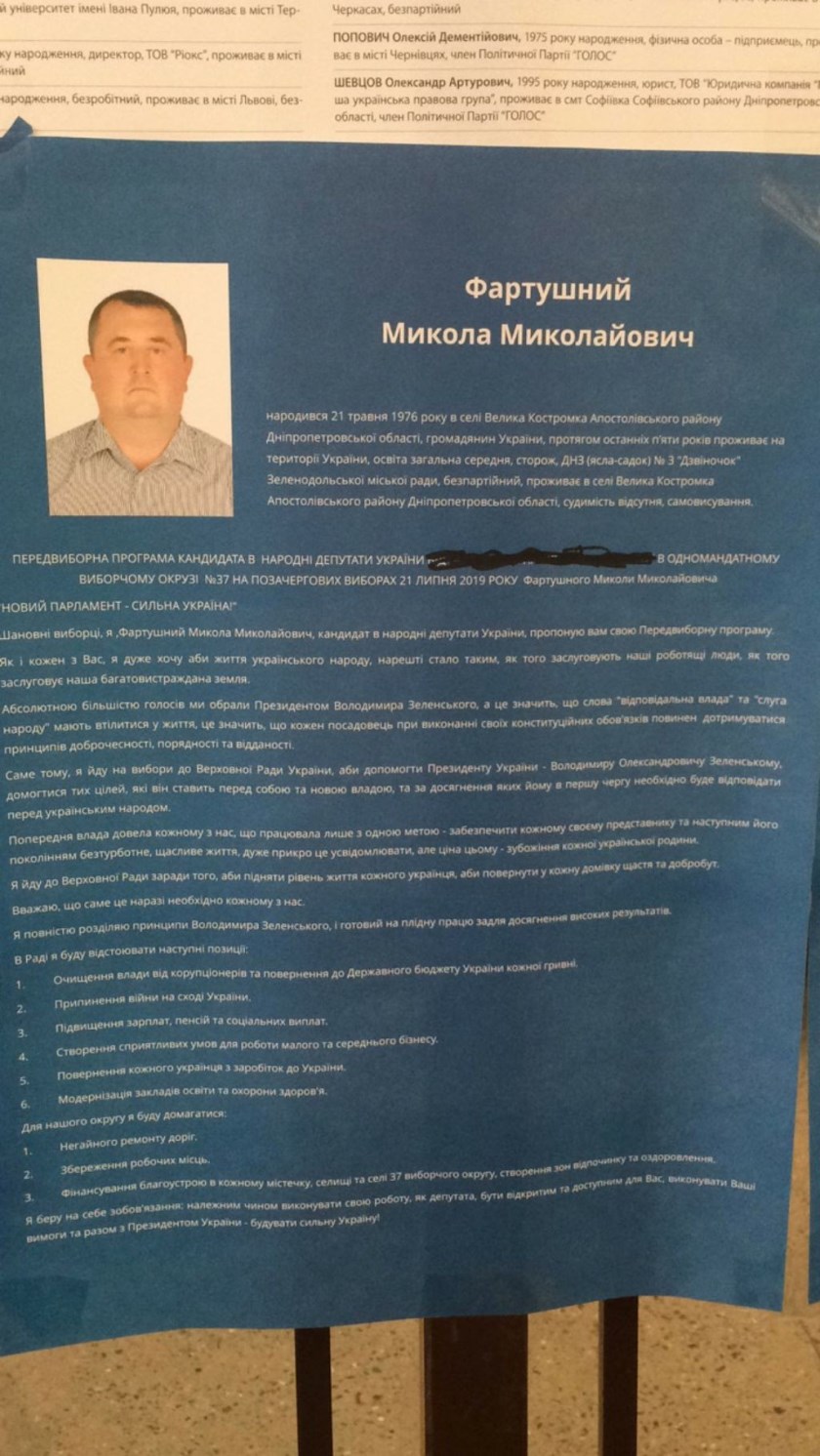 Так, зокрема, на плакатах зазначили, що кандидата Миколу Фартушного висунула політична партія «Слуга Народу», хоча на сайті ЦВК вказано, що Микола Фартушний – самовисуванець. Зазначимо, що на дільницях поряд розміщувався плакат висуванець партії «Слуга Народу» Ігоря Фартушного.