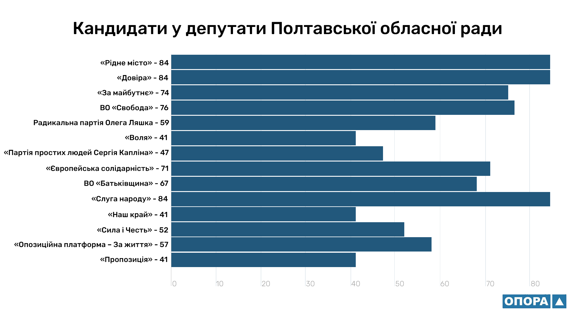 Найбільше кандидатів — по 84 — подали партії «Рідне місто», «Довіра» та «Слуга народу». Про це йдеться у відповідній постанові Полтавської обласної ТВК. ОПОРА проаналізувала перші п’ятірки кандидатів.