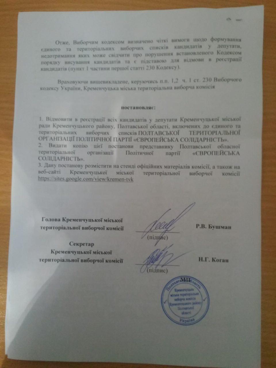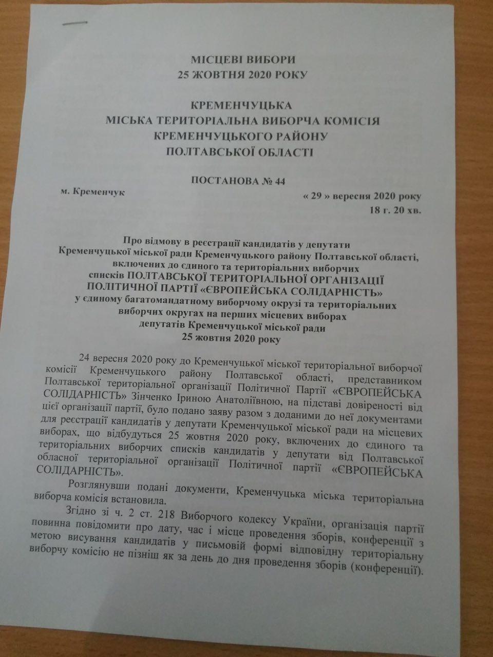 29 вересня члени Кременчуцької міської територіальної виборчої комісії винесли рішення про відмову у реєстрації усіх кандидатів у депутати Кременчуцької міськради від політичної партії «Європейська солідарність».