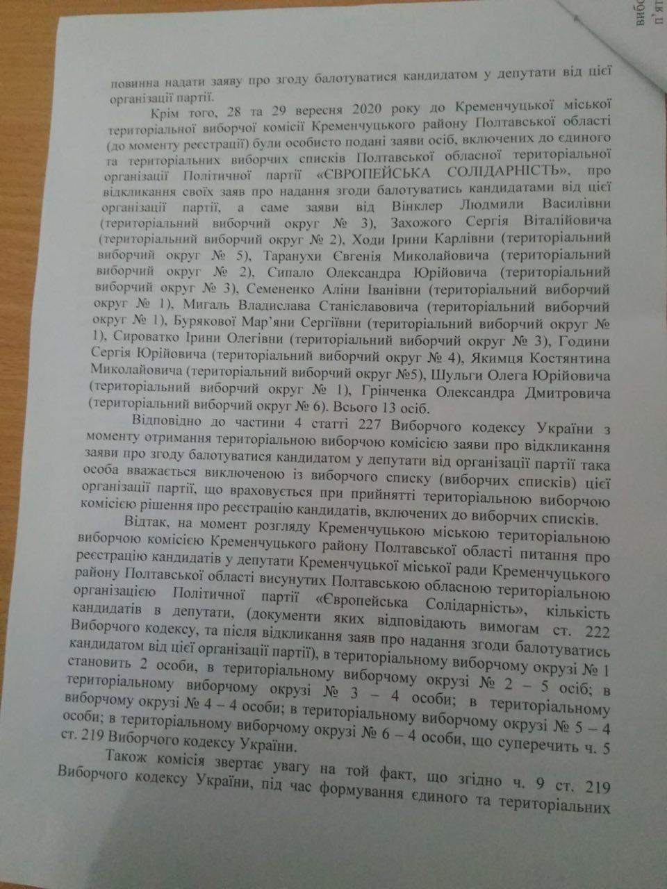 Перед засіданням ТВК, 28 та 29 вересня, 13 осіб, включених до списку ПП «Європейська Солідарність», подали до комісії заяви про відмову балотуватися. Це призвело до кількості кандидатів на округах менше ніж 5, що суперечить ч. 5 ст. 219 ВК України. Також через відмови потенційних кандидатів не можливо було дотримання гендерної квоти. Тож у реєстрації усіх кандидатів у депутати Кременчуцької міськради від політичної партії «Європейська солідарність» політичній силі відмовили.
