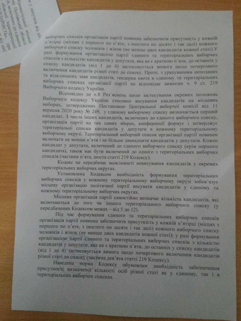 Кременчуцька міська територіальна виборча комісія на засіданні відмовила у реєстрації кандидатів від «Європейської солідарності», втім Полтавський окружний адміністративний суд скасував це рішення. Члени Кременчуцької міської територіальної виборчої комісії звернулись за роз’ясненнями до Центральної виборчої комісії. І лише через тиждень кандидатів від політсили зареєстрували.
