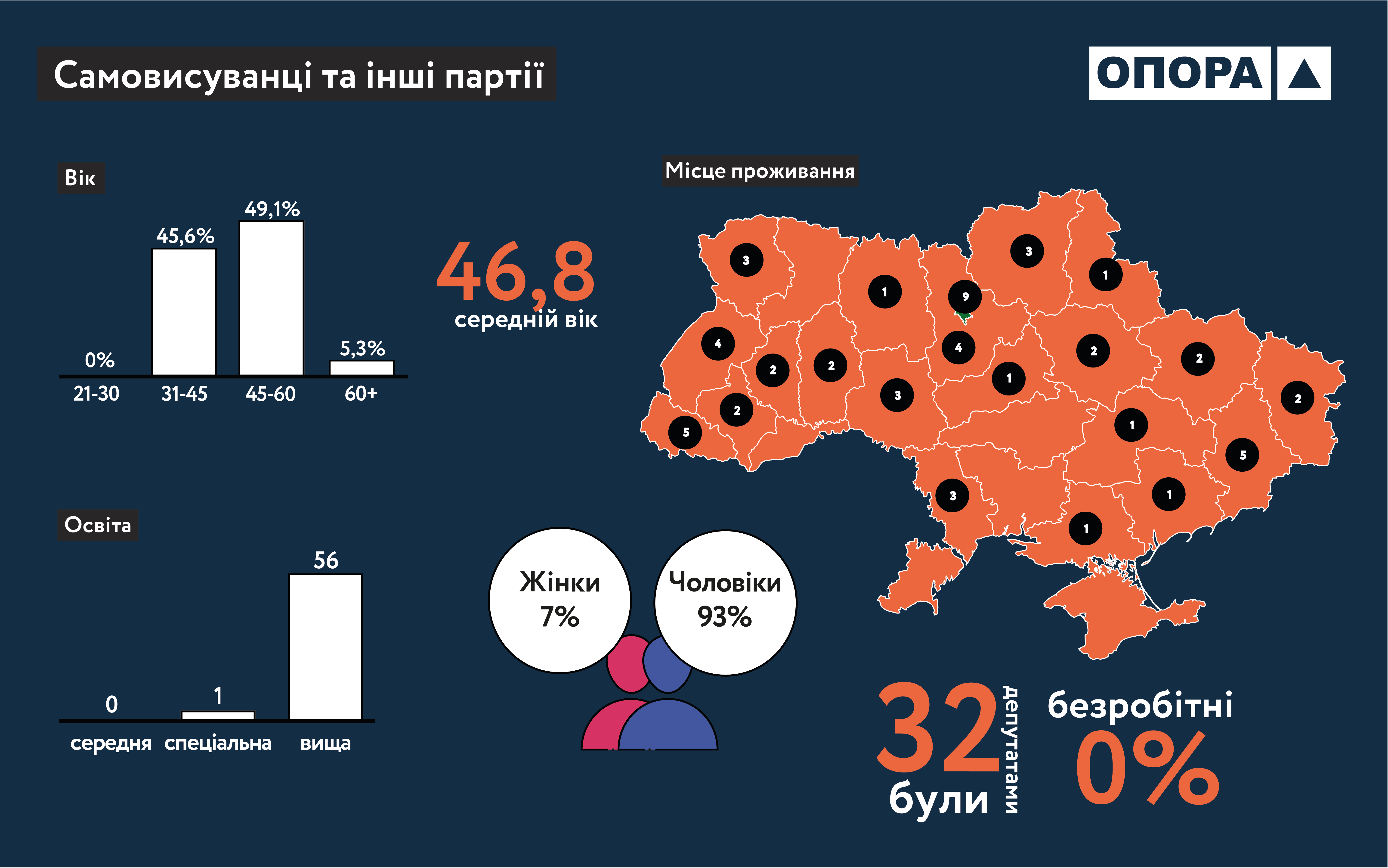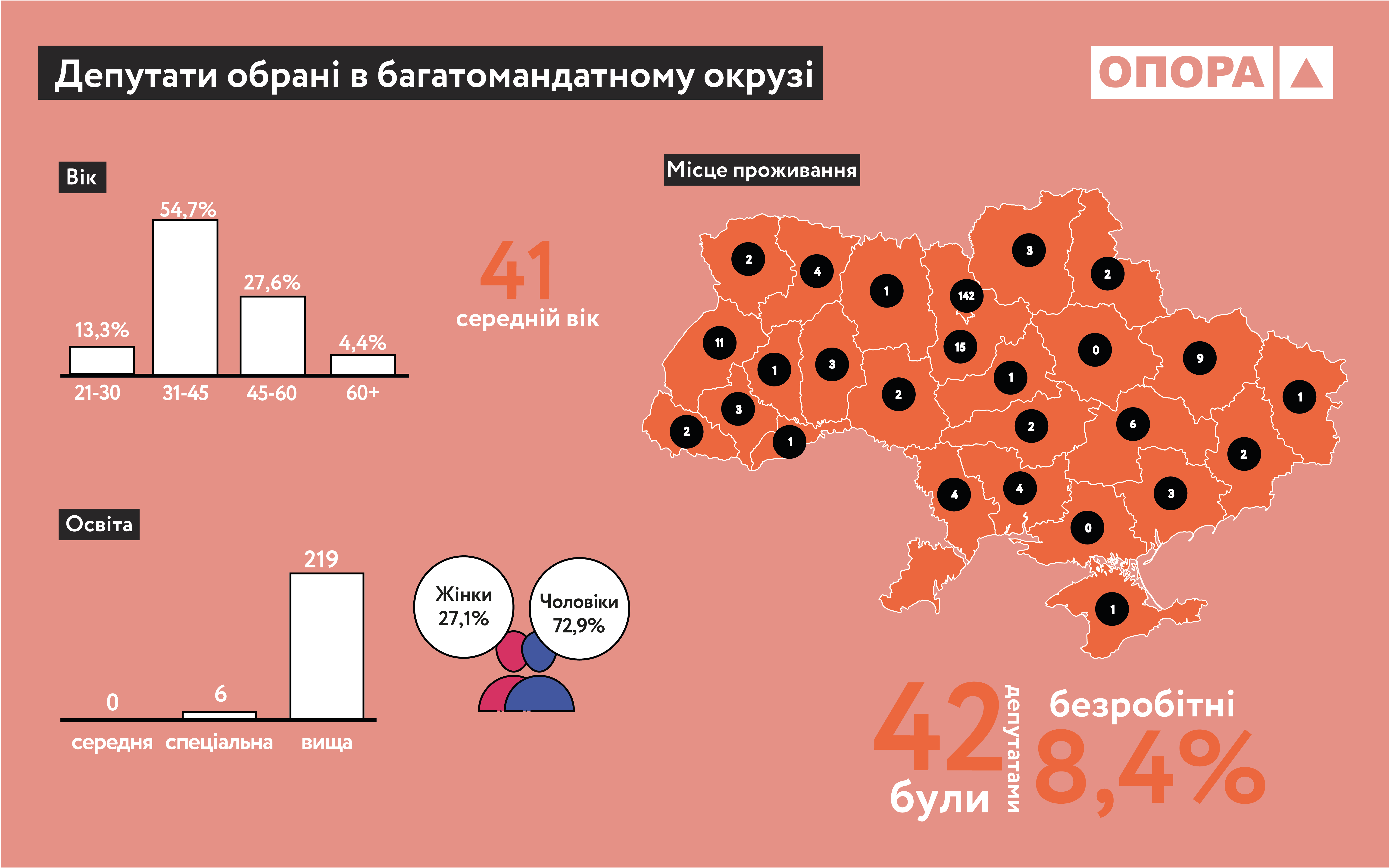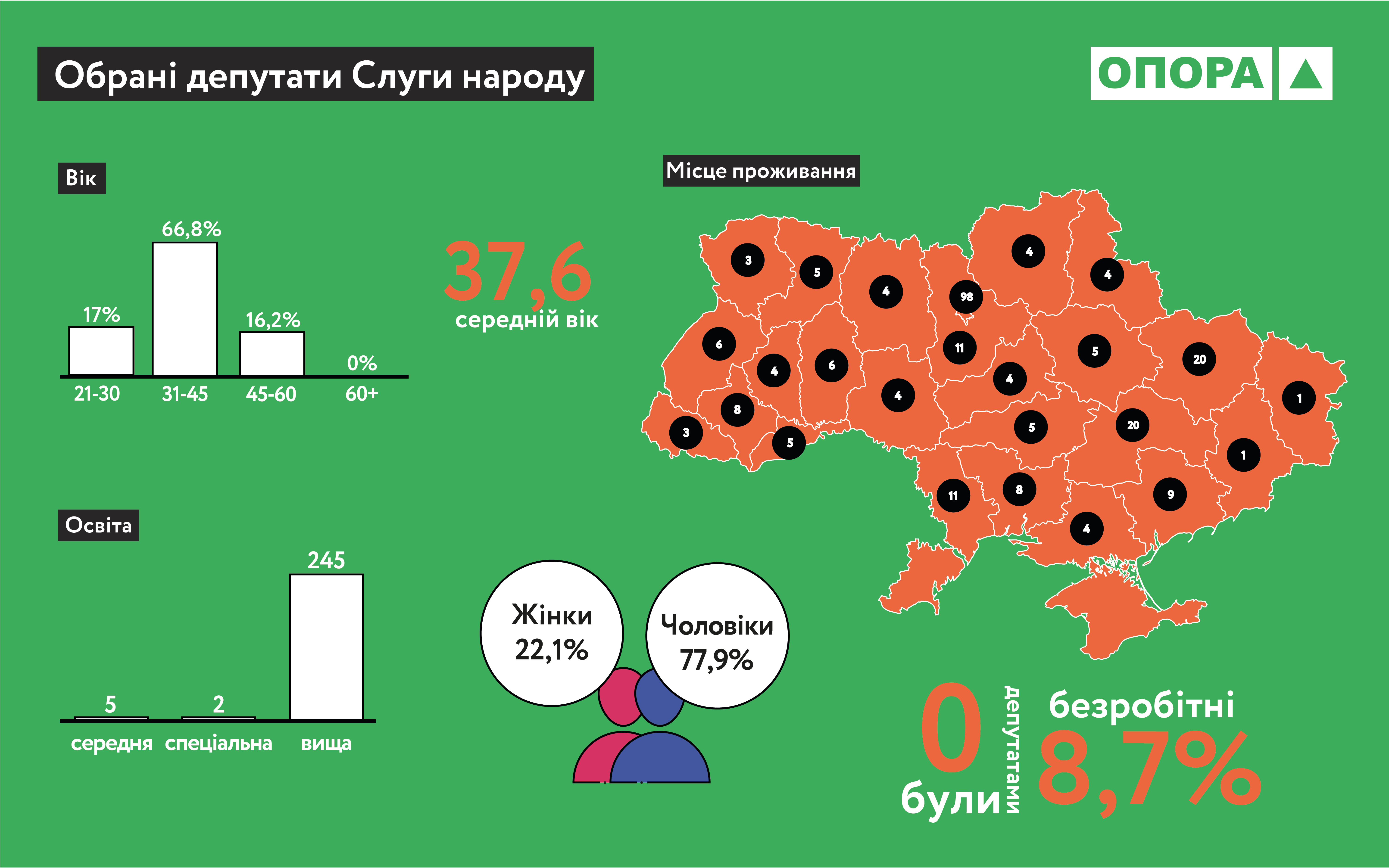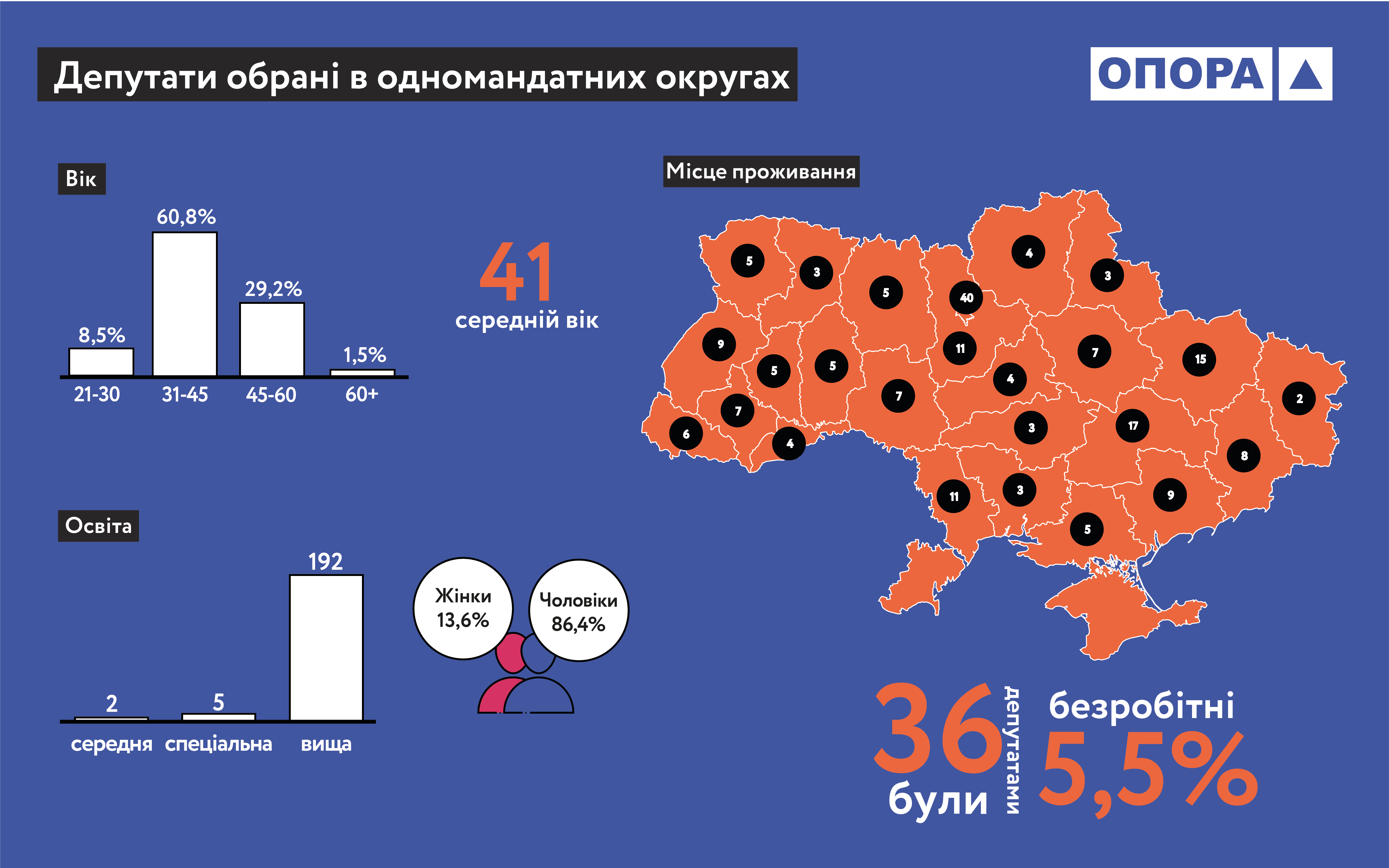 Якщо подивитись у розрізі обрання в загальнодержавному багатомандатному окрузі та в одномандатних округах, то серед майбутніх депутатів-списочників 164 чоловіки та 61 жінка. Більшість із них проживає в Києві. Вищу освіту мають 219 людей. Раніше вже були депутатами 42 людини, а безробітними до цього були 19 осіб. Що стосується депутатів-мажоритарників, то серед них 172 чоловіки та 27 жінок. Вищу освіту мають 193 людини. Раніше народними депутатами були 36 осіб, а безробітними – 11.