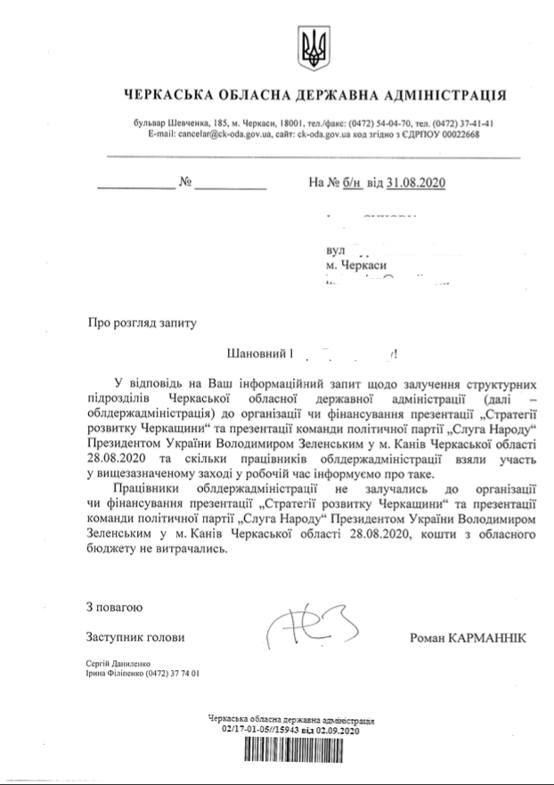 На завершення робочого візиту президент прибув у Канів, де головним заходом стала презентація Стратегії розвитку Черкащини. Для цього біля підніжжя Тарасової гори змонтували сцену, оздоблену банерами зеленого кольору із написом «Зе! Місцеві». Територію огородили парканом і людей до середини пускали за списками. Серед присутніх були також депутати-мажоритарники, які представляють Черкащину в парламенті: Любов Шпак (ОВО 194), Олег Арсенюк (ОВО 195) та Олександр Скічко (ОВО 197). На заході виступав народний депутат Олександр Завітневич, котрий є очільником обласного осередку партії “Слуга народу”. Також в робочий час (бл. 16:00) тут були присутніми чимало посадових осіб, держслужбовців та працівників ОДА.
