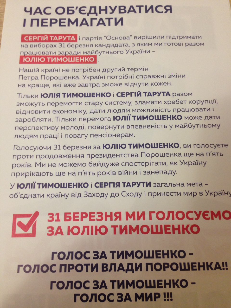На площі, де відбувалась зустріч з виборцями, були розміщені агітаційні намети, в яких розповсюджувались друковані матеріали від двох кандидатів – Юлії Тимошенко та Сергія Тарути. Матеріали останнього були з закликами віддати голос за Тимошенко.