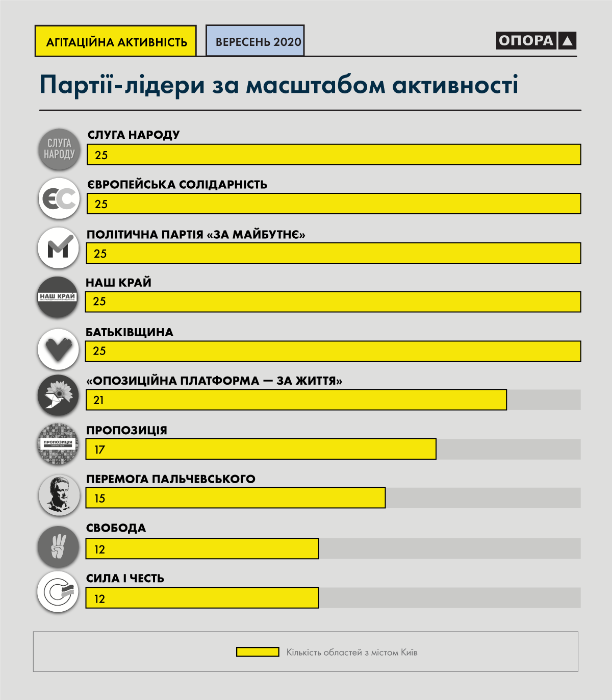 П’ять політичних партій є лідерами за масштабом агітаційної активності в регіонах. А саме “Слуга народу”, “За майбутнє”, “Європейська Солідарність”, ВО “Батьківщина” і “Наш край” у вересні проводили повноцінні загальнонаціональні кампанії в усіх областях України. Ще три політичні сили, “Опозиційна платформа – За життя”, “Пропозиція” і “Перемога Пальчевського”, представлені агітаційними заходами в більшості областей України. Десять інших політичних партій, за оцінками спостерігачів, проводять активну передвиборчу роботу в багатьох регіонах України, однак не в загальнонаціональному вимірі. Решта активних учасників місцевих виборів (понад 50 партій) сконцентрувала свою агітаційну діяльність у межах конкретних регіонів (областей).