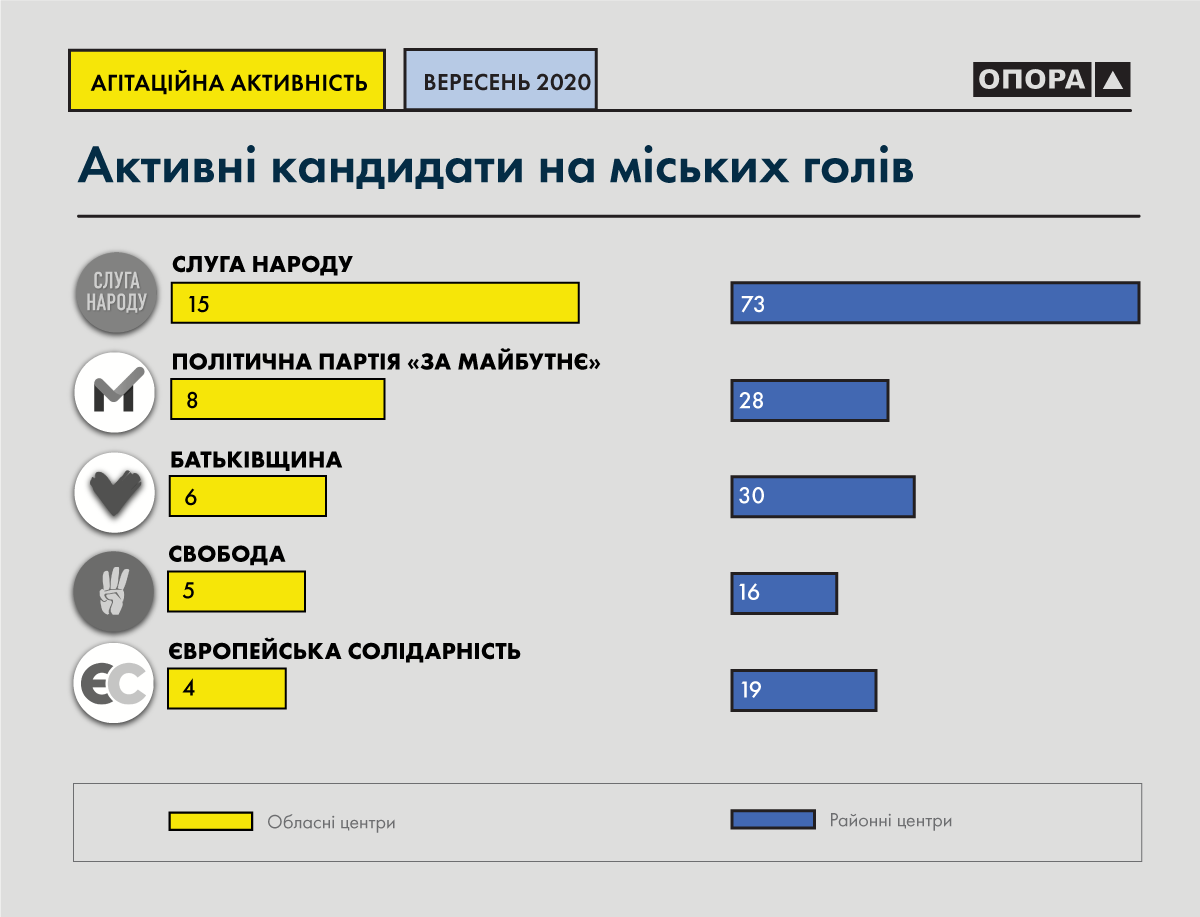 У розрізі агітаційної роботи кандидатів на посаду місцевих голів у районних та обласних центрах найбільш помітними є представники “Слуги народу” (активні в 73 районах та 15 обласних центрах). Партії “За майбутнє” і ВО “Батьківщина” мають порівняно меншу, але так само значну в масштабах України кількість потенційних кандидатів на посаду місцевих голів районних та обласних міст, які за активно проводили агітаційні заходи.