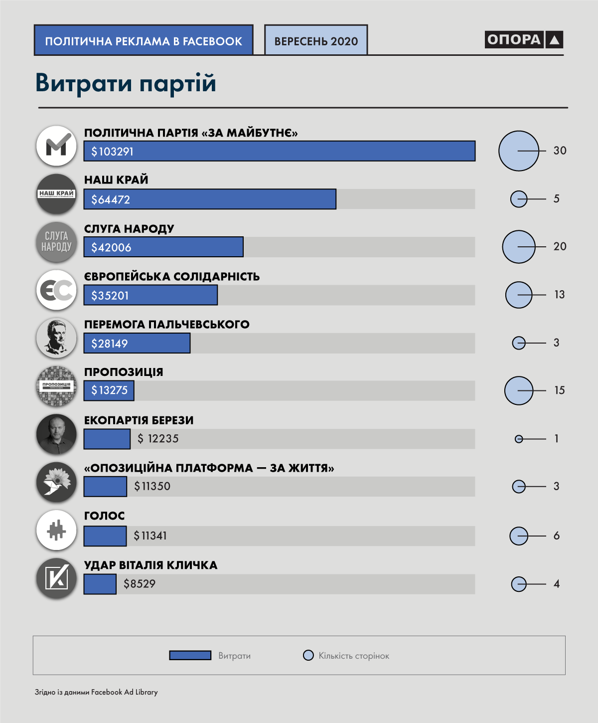 У вересні першість серед політичних партій за витратами на рекламу в соціальній мережі Facebook впевнено утримувала партія “За майбутнє”: вона опублікувала 3 728 рекламних дописів загальною вартістю понад 103 тисячі доларів. Помітно, що партія позиціонує себе як загальноукраїнська: таргетинг спрямований на всю територію України. Про це також свідчить велика кількість активних регіональних сторінок політсили. Так, у вересні політичну рекламу у Facebook розмістили 30 партійних сторінок.
