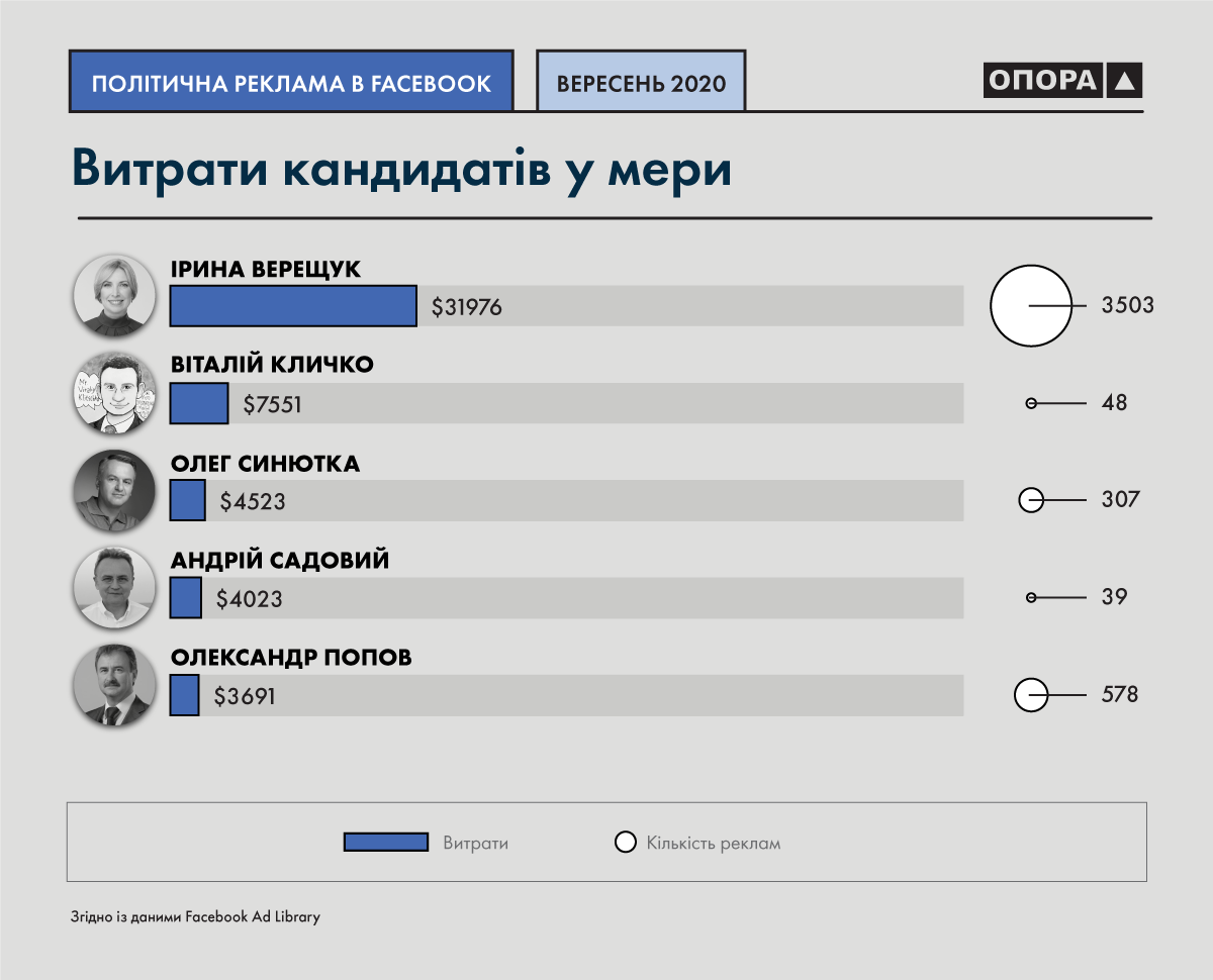 Також активністю у Facebook у вересні відзначилися кандидат у міські голови Одеси Сергій Калинчук (понад 3 500 $), у мери Львова – Тарас Кльофа та Ігор Васюник (понад 3 200 $ кожен), у мери Полтави – Андрій Матковський (понад 3 200 $), у мери Києва – Сергій Притула (понад 3 100 $).