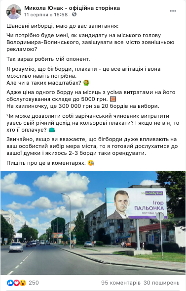 11 серпня на своїй сторінці в мережі Facebook Микола Юнак, який заявив, що буде балотуватись на посаду Володимир-Волинського міського голови, запитував виборців, чи варто йому «завішувати все місто зовнішньою рекламою», як це уже робить його потенційний опонент Ігор Пальонка («За майбутнє»). У публікації наголошується, що один білборд вартує близько 5 тис. грн, а оренда 20 носіїв зовнішньої реклами з обслуговуванням обійдеться його опоненту – Зарічанському сільському голові – у майже 300 тис. грн, що становить майже весь його річний заробіток. Відтак, Микола Юнак з негативним підтекстом натякає, що Ігор Пальонка не зможе самостійно оплатити таку рекламу.