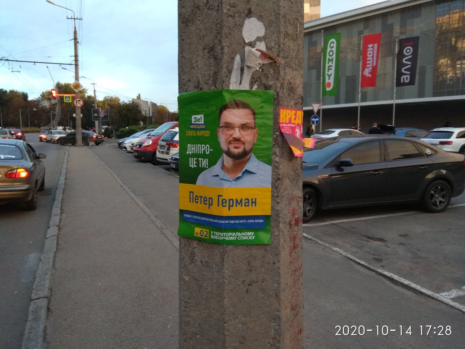 Цього ж дня поблизу ТРЦ «Дафі» спостерігачі ОПОРИ зафіксували, що на опорі вуличного освітлення наклеєний плакат кандидата в депутати до Дніпропетровської обласної ради Петера Германа («Слуга народу»). Поряд з торгівельним центром, за адресою бульвар Зоряний 1, на боковій стіні житлової багатоповерхівки виявлено передвиборчий плакат без вихідних даних кандидата до Дніпропетровської обласної ради Андрія Денисенка («Європейська Солідарність»). На вулиці Андрія Фабра на опорах вуличного освітлення виявлено передвиборчі плакати без вихідних даних кандидата в депутати до Дніпровської міської ради від партії «Слуга народу» Владислава Самойленка.