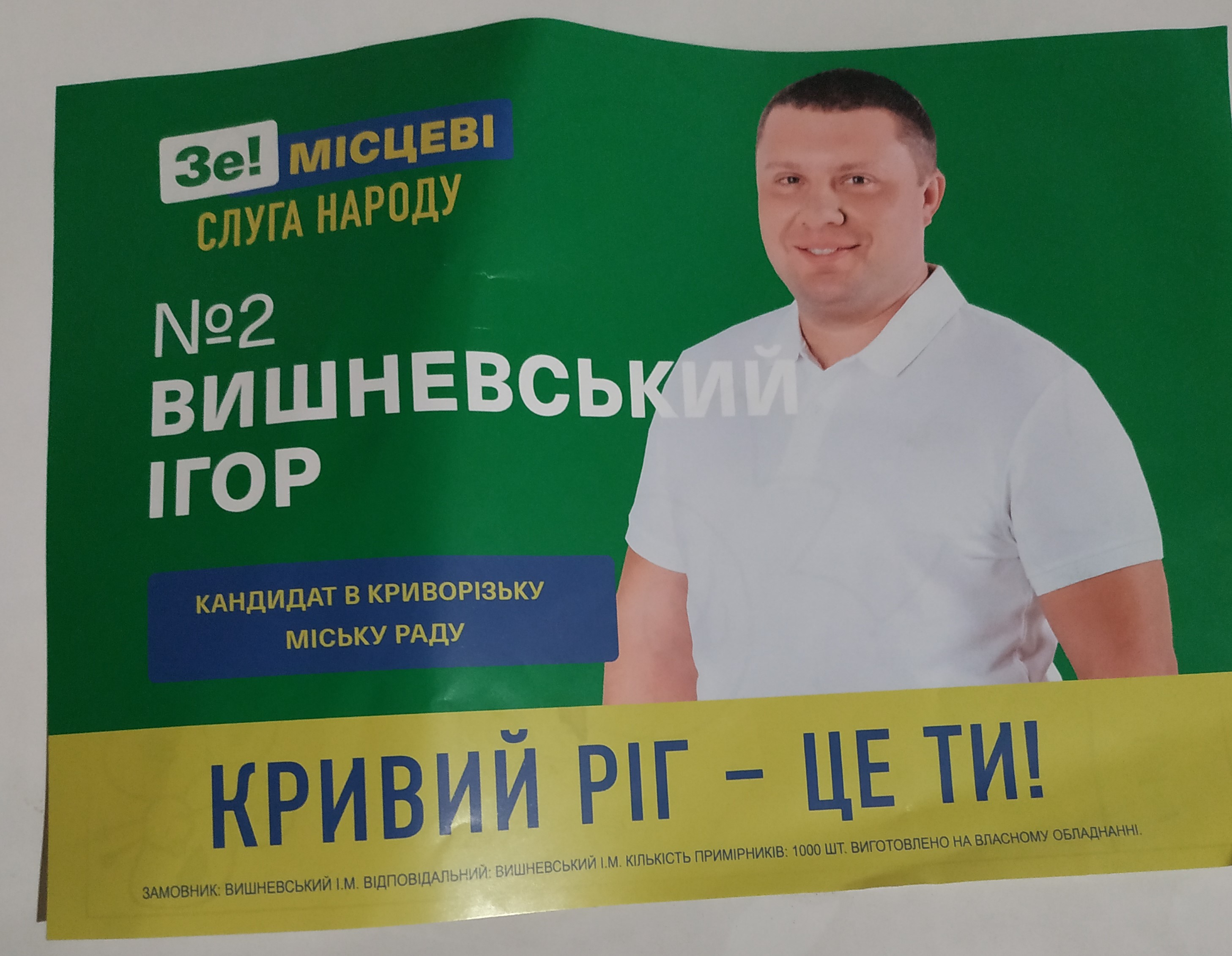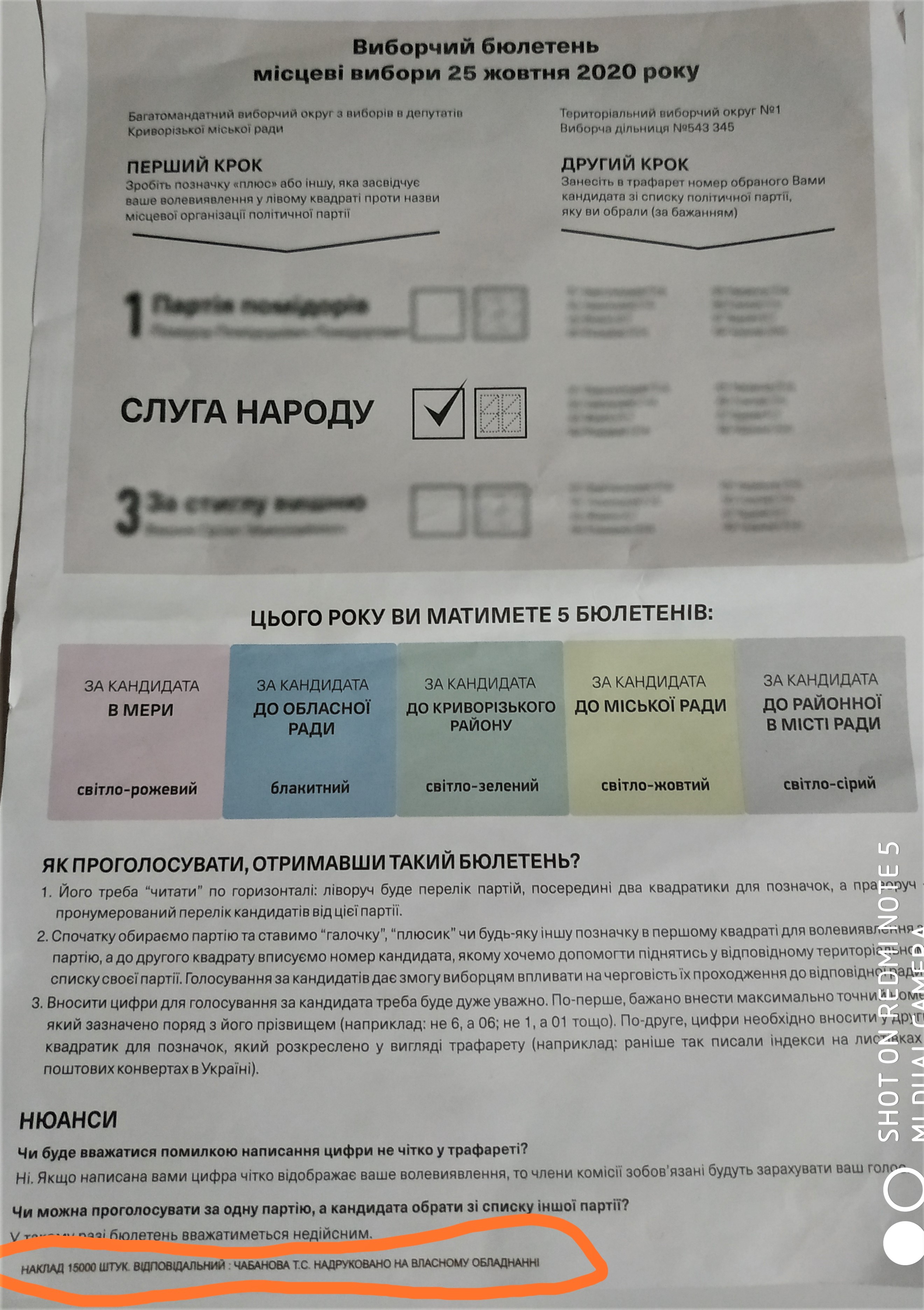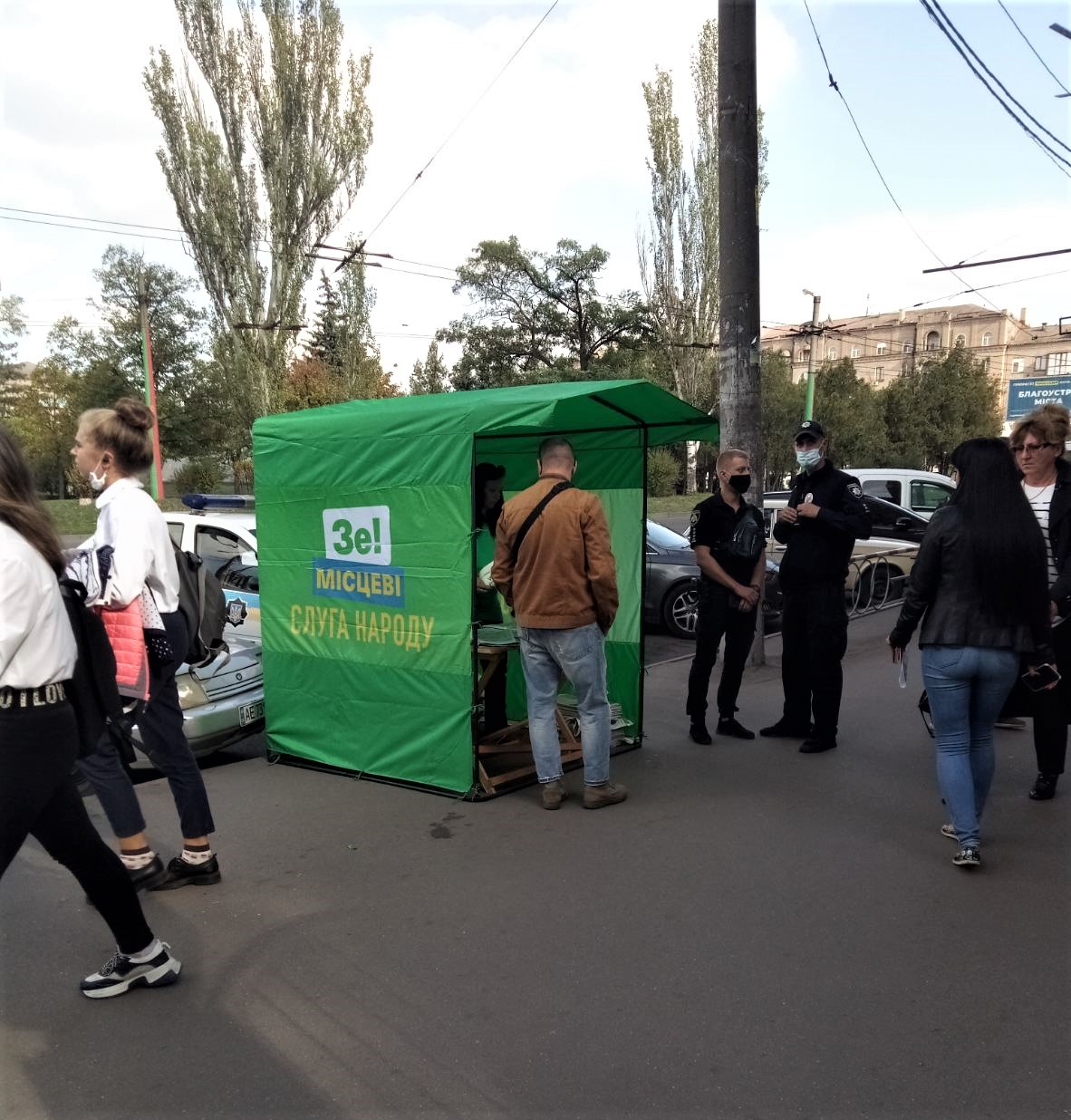 12 жовтня на пр. Поштовому у Кривому Розі спостерігачі ОПОРИ зафіксували агітаційний намет партії «Слуга народу», поряд з ним волонтери роздавали листівки кандидатів у депутати та кандидата на посаду міського голови Кривого Рогу Дмитра Шевчика. Також в наметі роздавали лист А4 з написом «Виборчий бюлетень місцеві вибори 25 жовтня 2020 року», на якому не було вказано замовника тиражу. Спостерігачі ОПОРИ викликали поліцію та склали заяву про можливе порушення виборчого законодавства.