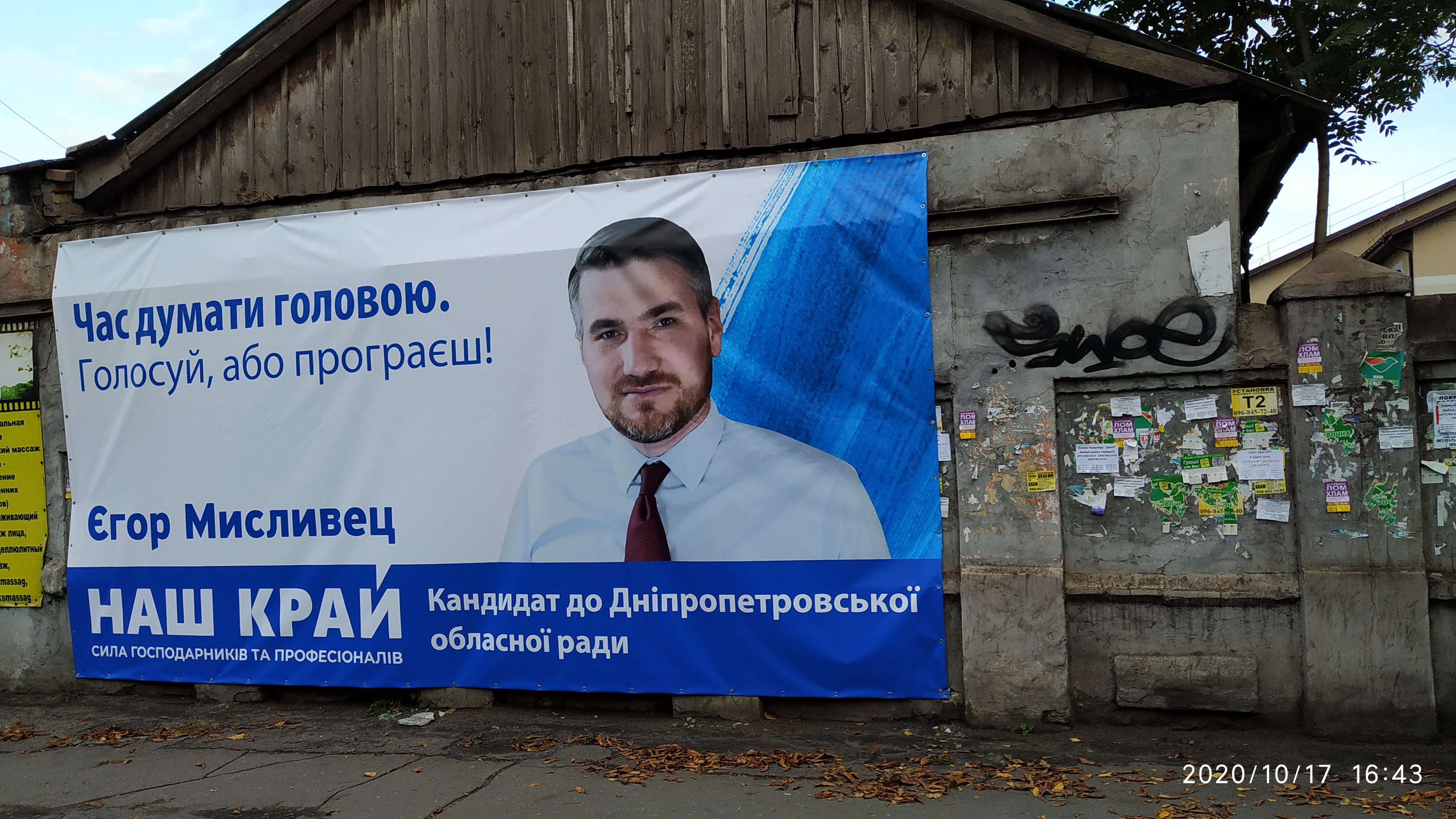 17 жовтня, на пр. Свободи, 15, на огорожі біля будинку, спостерігач ОПОРИ зафіксуавав рекламний банер кандидата до Дніпропетровської обласної ради від партії «Наш край» Єгора Мисливця без вихідних даних. Була написана заява про можливе правопорушення.