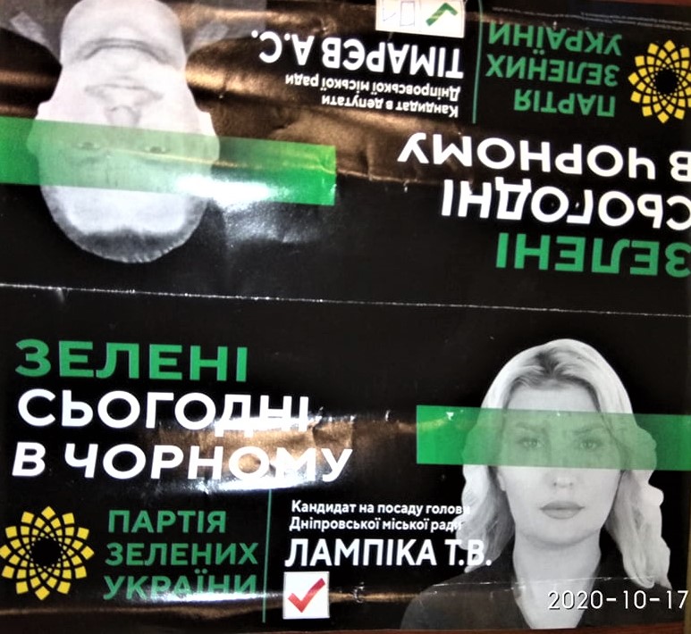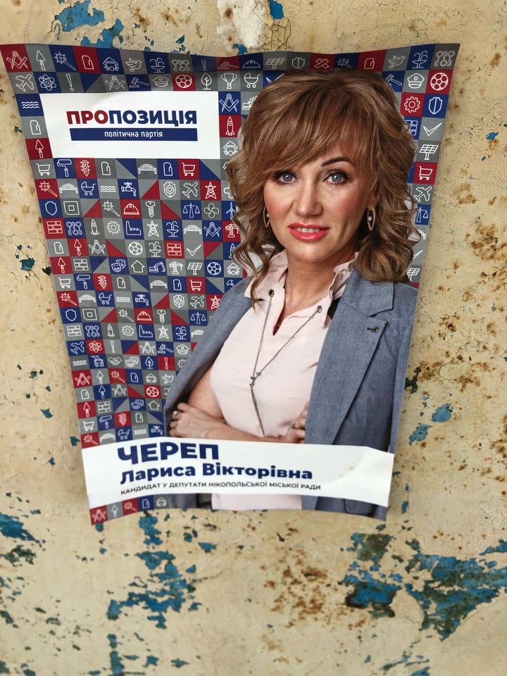 В м. Нікополь за адресою вул. Патріотів, 123, прямо на зупинці громадського транспорту були зафіксовані агітаційні плакати кандидатки у депутати до Нікопольської міської ради Лариси Череп («Пропозиція»). Плакати були без вихідних даних. Поліція зареєструвала заяву про можливе правопорушення.