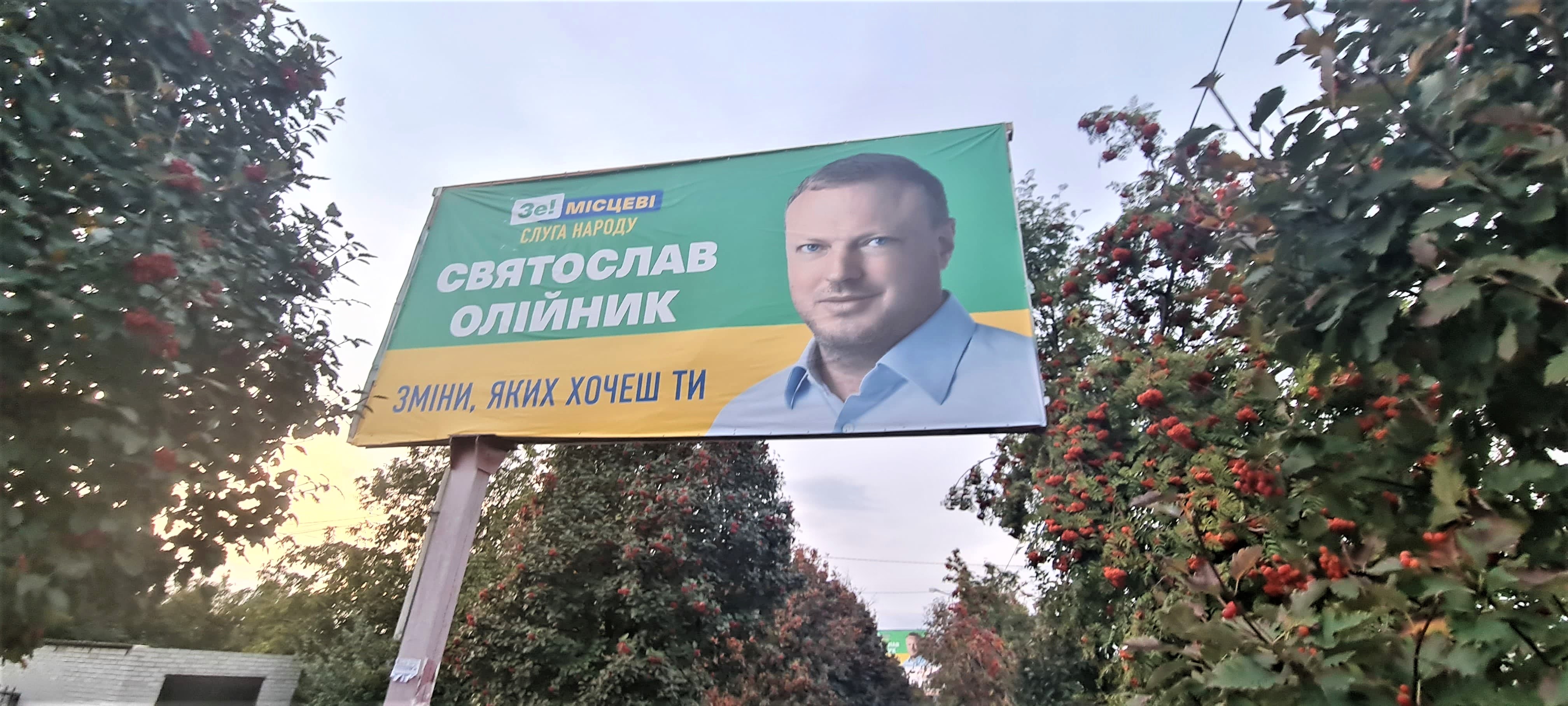 В м. Синельниково по вул. Садова, 37, виявлено білборд Святослава Олійника (голова Дніпропетровської обласної ради, кандидат у депутати облради від партії «Слуга народу») без вихідних даних.