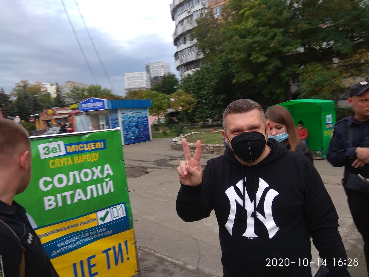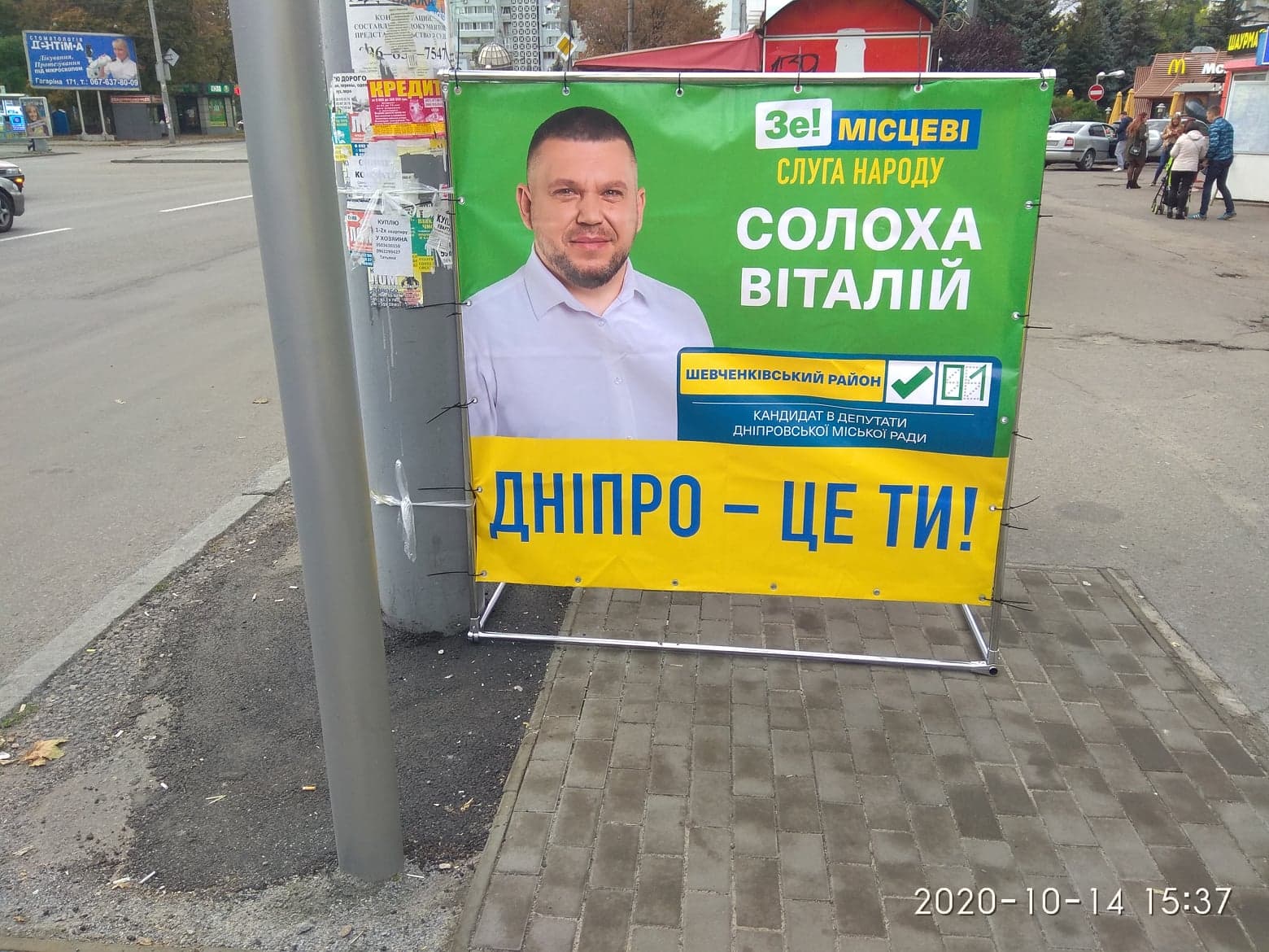 14 жовтня спостерігачами ОПОРИ також на пр. Гагаріна зафіксував рекламну конструкція, на якій були розміщені чотири передвиборчі плакати партії «Слуга народу». На одному з них була реклама кандидата в депутати Дніпровської міської ради Віталія Солохи. На плакатах не були зазначені вихідні дані, а сама конструкція, можливо, встановлена з порушенням правил благоустрою. Поліція зафіксувала ймовірне правопорушення.