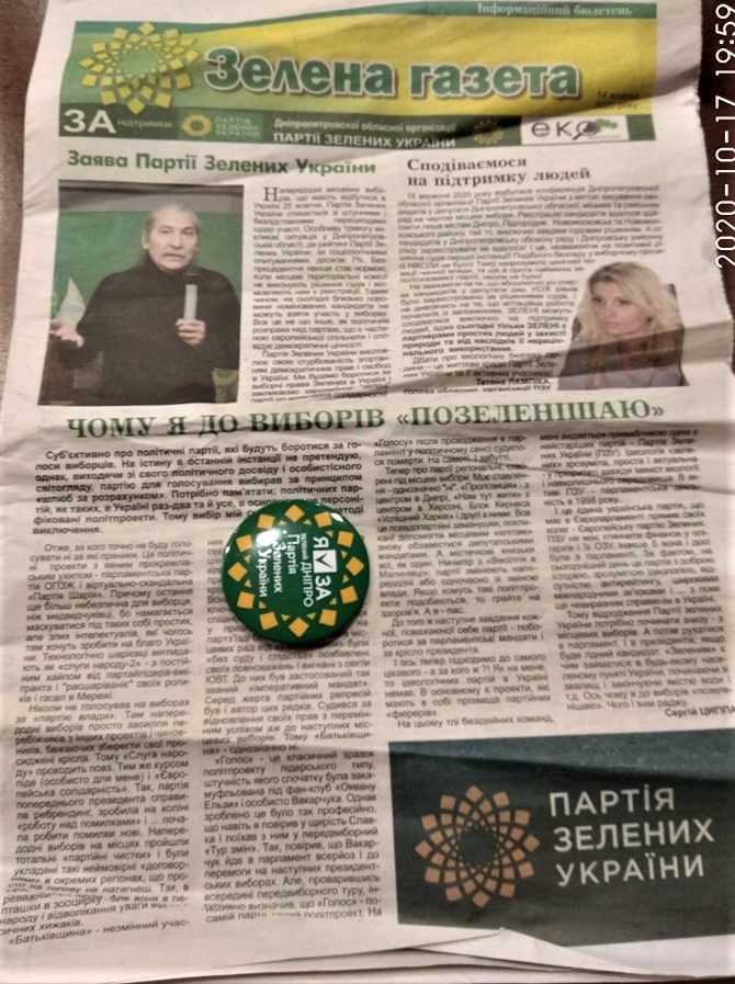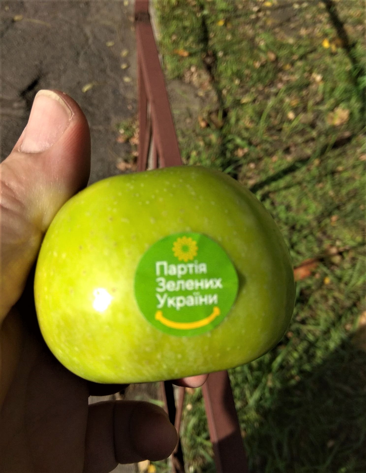 17 жовтня в Дніпрі, на пр. Гагаріна (район Підстанції), спостерігач ОПОРИ зафіксував агітаційні намети декількох партій, в тому числі «Партії Зелених України». Окрім звичної агітаційної продукції всім бажаючим пропонують пригоститися яблуками. Агітатор в наметі «Партії Зелених України» запропонував ознайомитися з партійною газетою, буклетами, вручив значок з назвою партії та пригостив яблуком. В наметі стояв ящик з яблуками, на кожному з них була наліпка «Партія Зелених України».