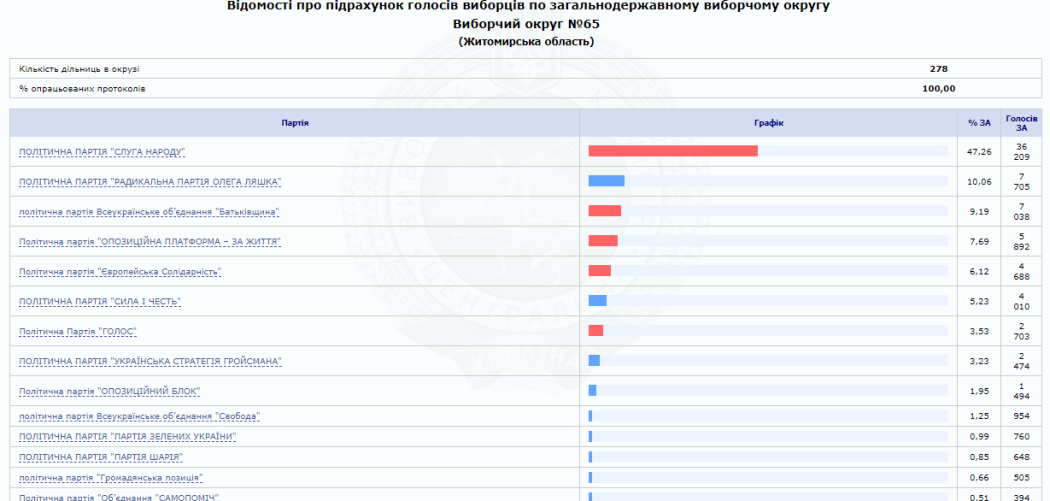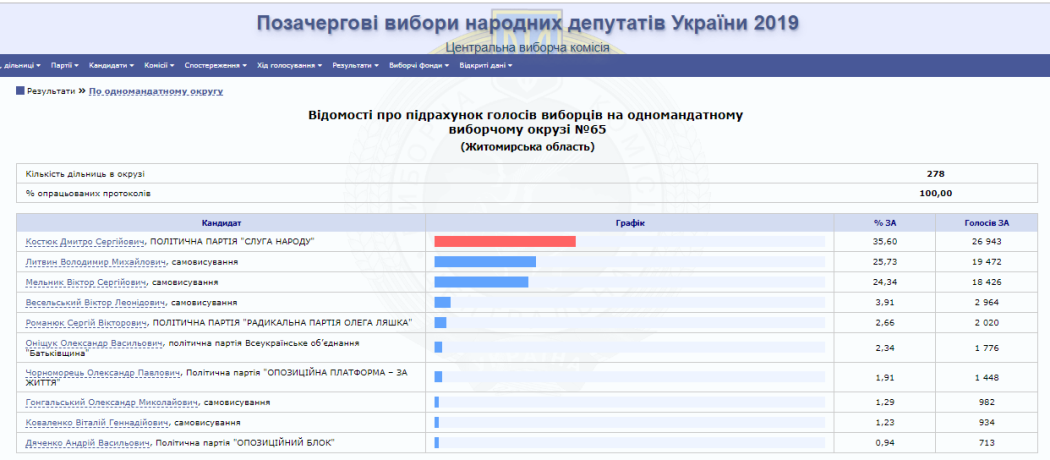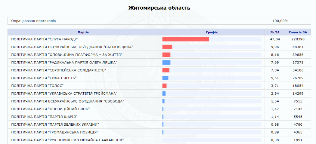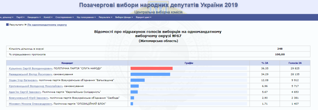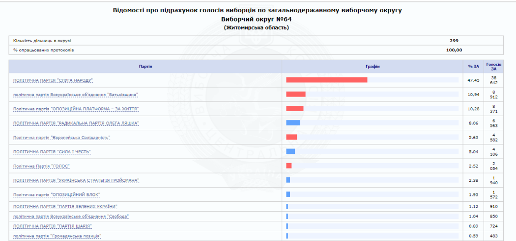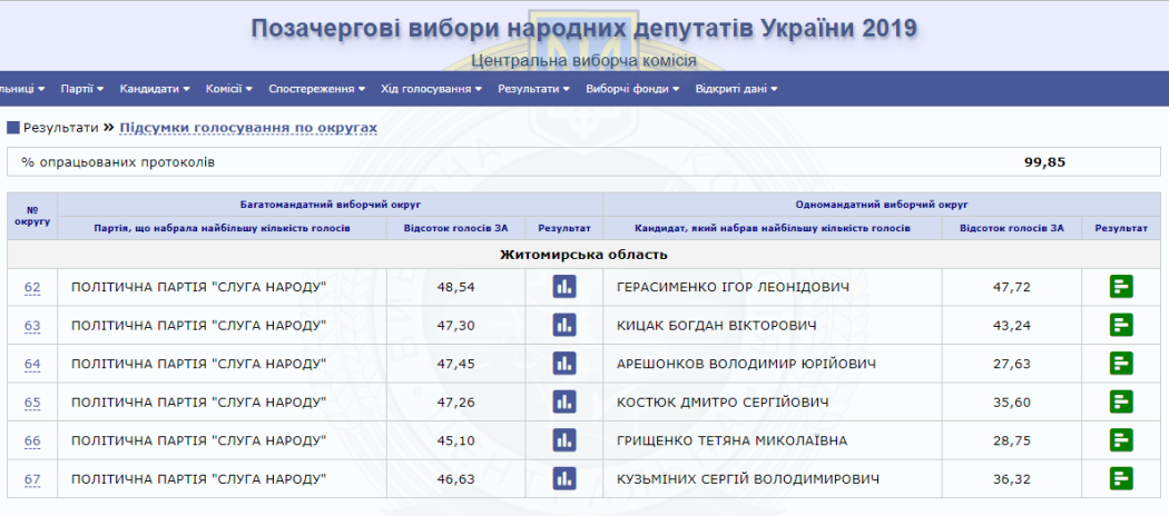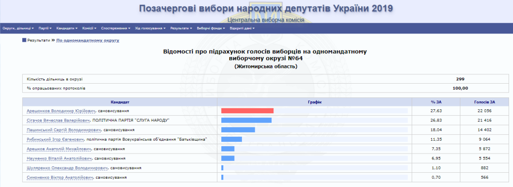 На сайті Центральної виборчої комісії вже є 100% опрацьованих протоколів від окружних виборчих комісій Житомирської області. За результатами парламентських виборів від регіону в Раду проходять 5 нових депутатів від партії «Слуга народу» та один чинний нардеп від одномандатного виборчого округу № 64 (м. Коростень) Володимир Арешонков.