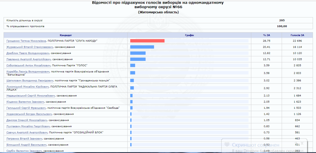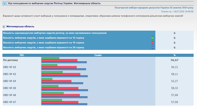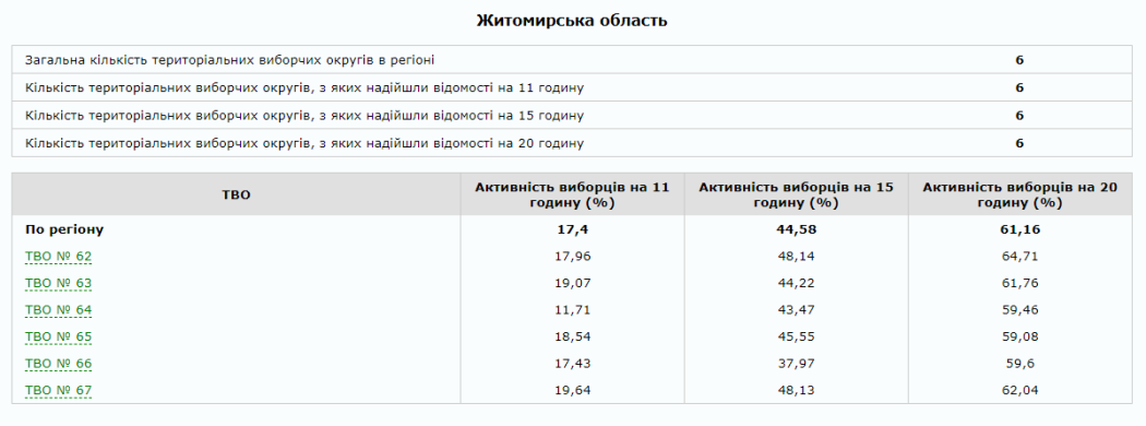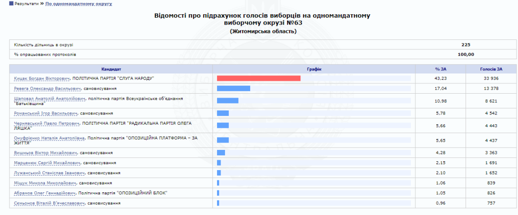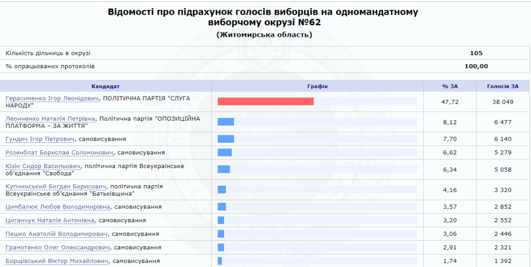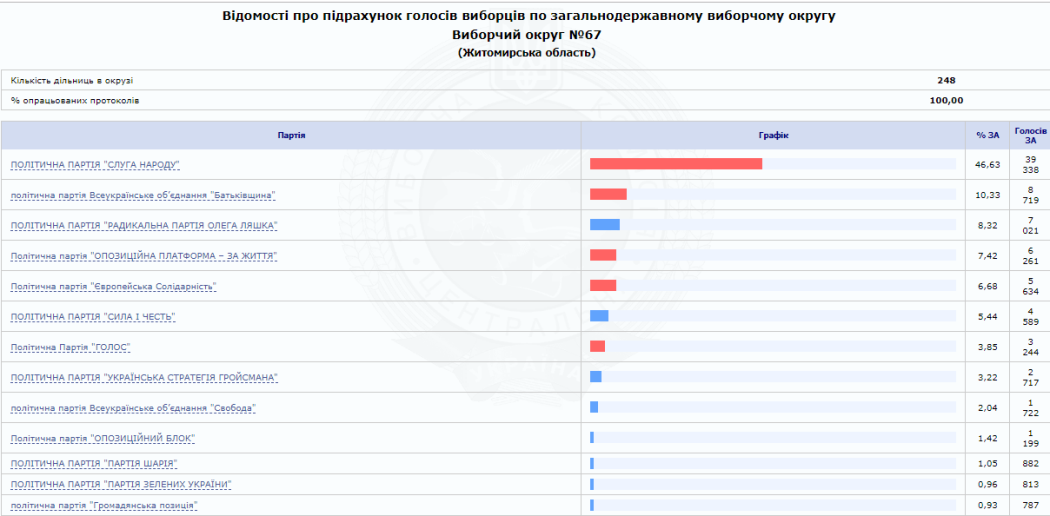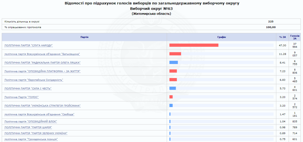 На сайті Центральної виборчої комісії вже є 100% опрацьованих протоколів від окружних виборчих комісій Житомирської області. За результатами парламентських виборів від регіону в Раду проходять 5 нових депутатів від партії «Слуга народу» та один чинний нардеп від одномандатного виборчого округу № 64 (м. Коростень) Володимир Арешонков.