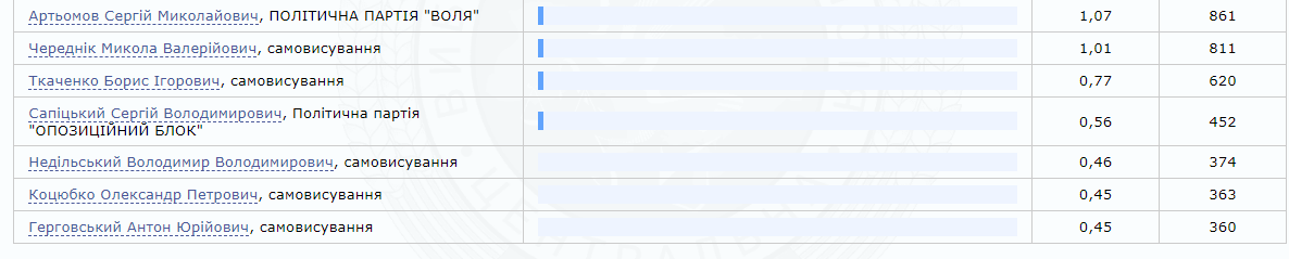 На 3 місці кандидат від ВО «Батьківщина» Ігор Ходак – 12,08% (9 912). В окрузі балотувалися 7 кандидатів.