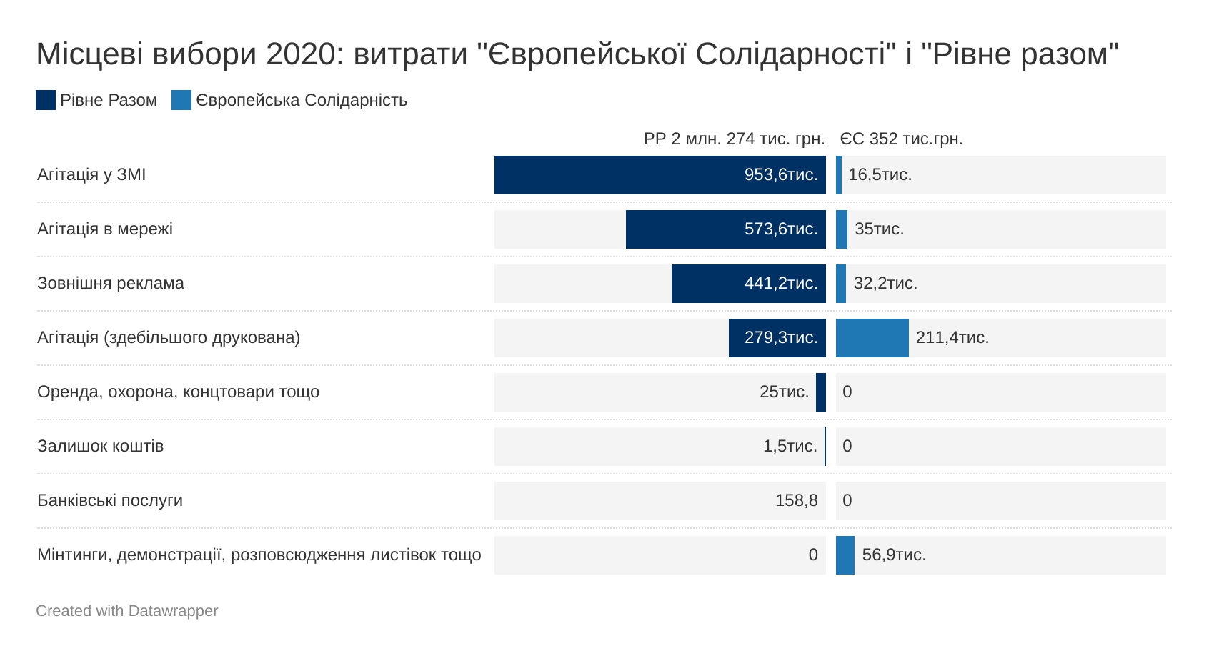 Партія “Рівне Разом” випередила за кількістю витрат всіх конкурентів – її фонд склав 2 мільйони 274 тисячі 331 гривню, з яких на кінець виборчого періоду витратили 2 мільйони 274 тисячі 331 гривню.