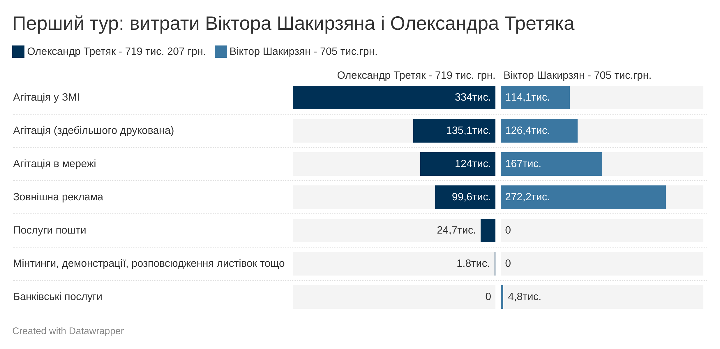 Розподіл фондових коштів у кандидатів на посаду міського голови був різним. Кандидат Олександр Третяк найбільше витратив на агітацію у ЗМІ – 334 тисячі гривень. Це майже половина його бюджету.