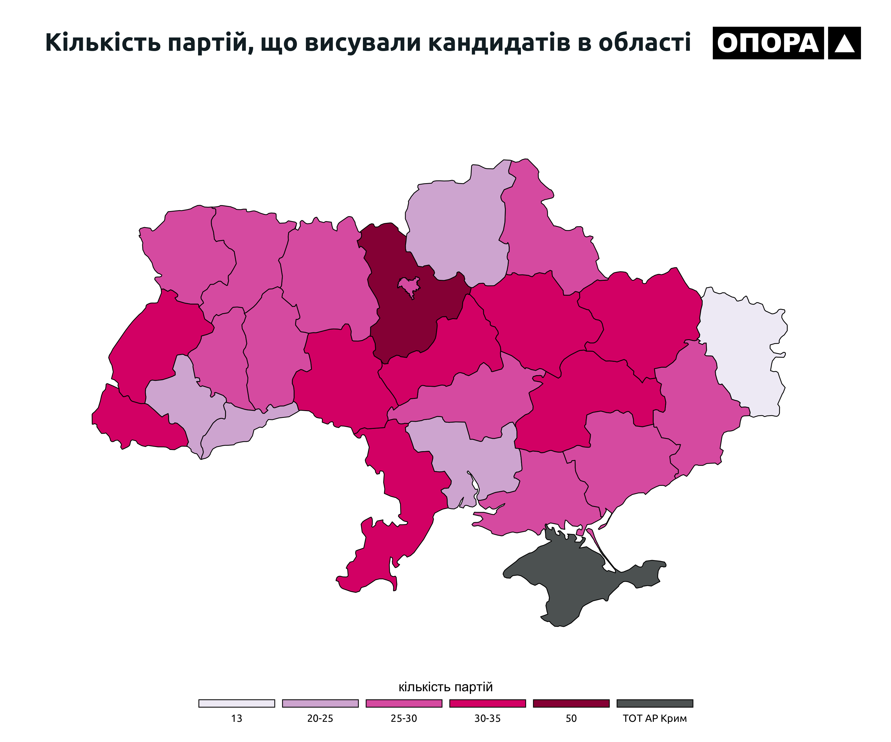 Значна кількість партій на останніх місцевих виборах були регіональними проєктами. 112 (77,8%) політичних сил висунули своїх кандидатів лише у 5 і менше областях України: 73 партій (50.7%) – взагалі лише в одній області, 18 (12.5%) – у двох, 10 (6.9%) – у трьох, 5 (3.5%) – у чотирьох та 6 (4.2%) – у п’яти.