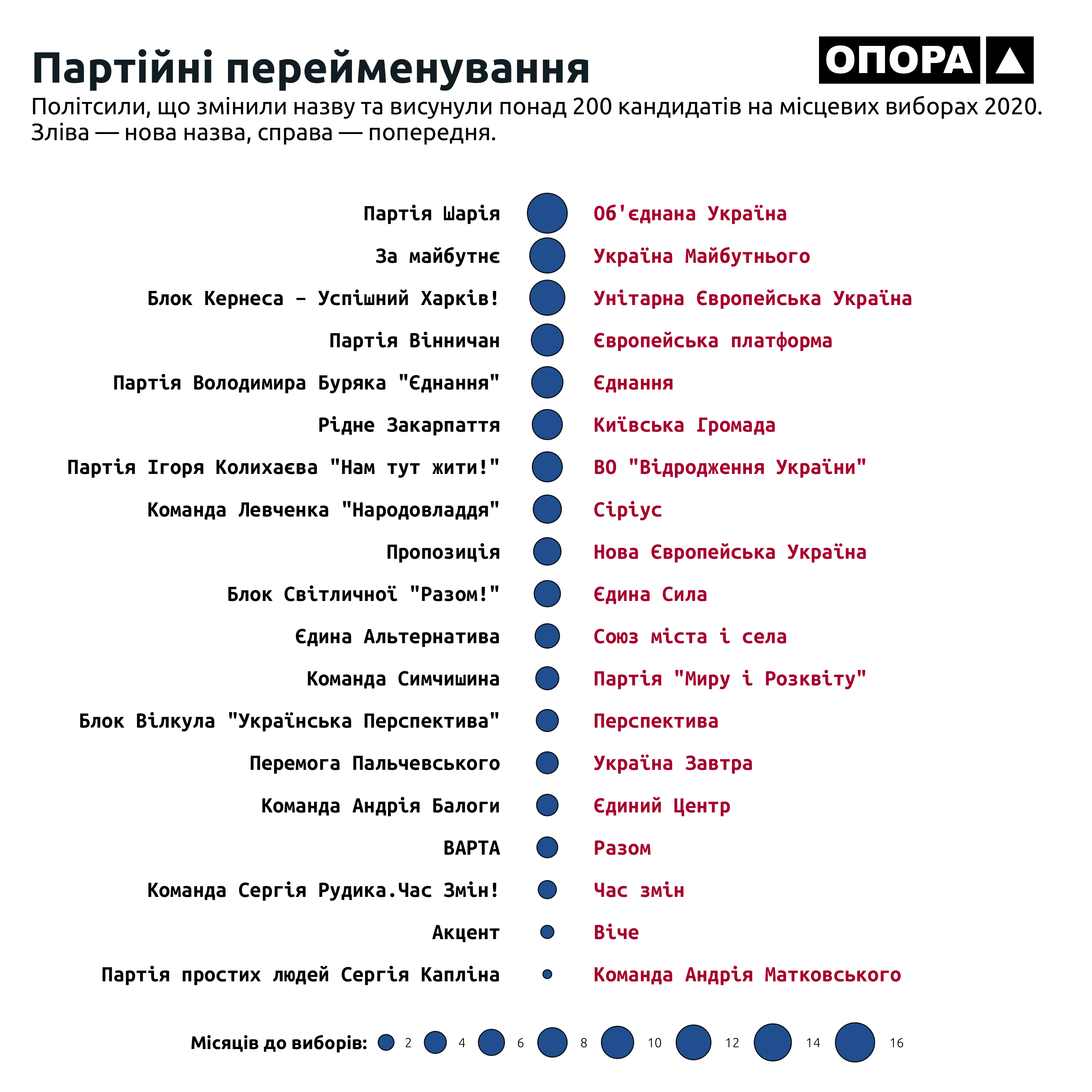 У зв’язку із партизацією виборів, певні політичні сили змінювали свої назви та керівництво напередодні місцевих виборів 2020 року. Метаморфози та перевтілення окремих проєктів заслуговують на прискіпливу увагу.