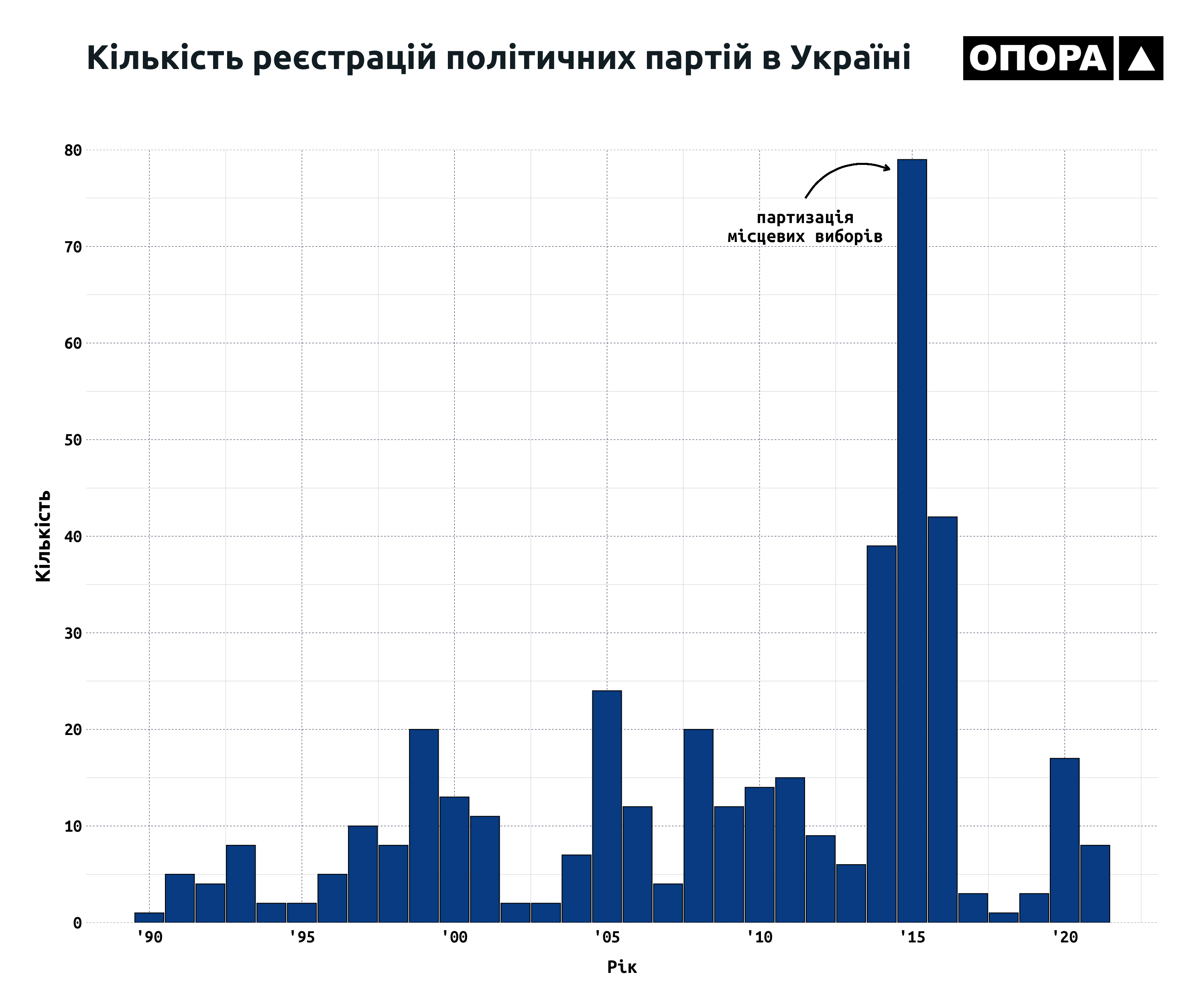 Крім того, в Україні реєструються і нові політичні партії. Так, лише з початку 2021 року зареєстровано 8 політичних сил: “Українці”, “Добробут”, “Досвід”, “Сила Єдності”, “Народна ініціатива”, “Мова”, “Гарант” та “Наше місто”. У 2020 – з’явилось 17 партій, натомість у 2019 – лише три. Проте справді “урожайним” з точки зору реєстрації для українського партбудівництва став 2015 рік – 79 політсил.