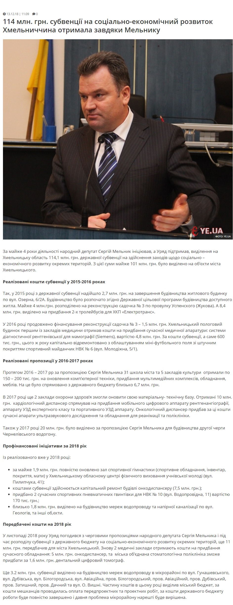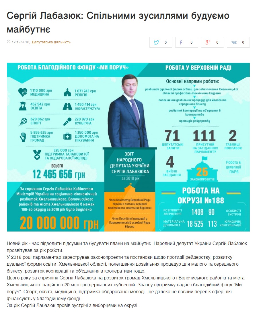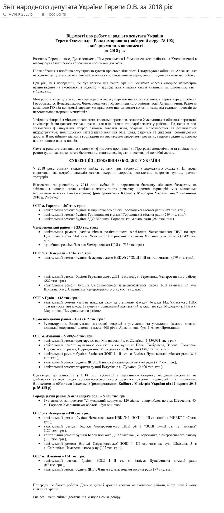 У звіті народного депутата за 2018 рік зазначається, що він «домігся виділення майже 20 млн грн. субвенції з державного бюджету».