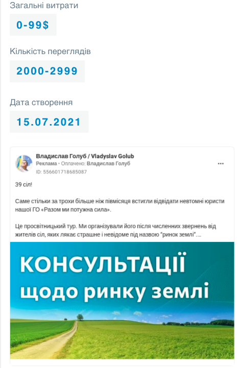 У липні нардеп-мажоритарник від 197-го округу в попередньому скликанні Владислав Голуб рекламував лише один допис зі своєї сторінки, витративши на це 10 $. У промотованому дописі йшлося про те, що юристи його ГО “Разом ми потужна сила” провели просвітницькі консультації щодо ринку землі у 39 селах.