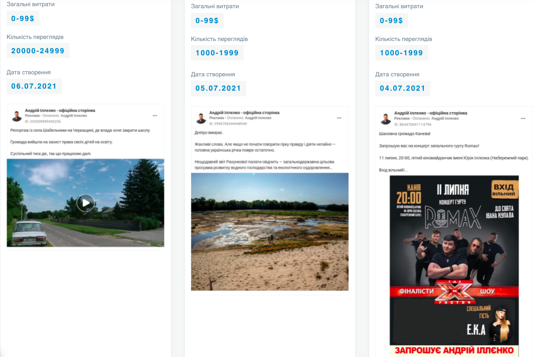 Потенційний кандидат від ВО “Свобода” Андрій Іллєнко платну промоцію для дописів зі своєї сторінки використовував за липень 17 разів, на що витратив 298$. Політик рекламував дописи із афішами організованих ним концертів на окрузі, а також дописи про екологічні та інфраструктурні проблеми округу, а також дописи про його візити на округ.