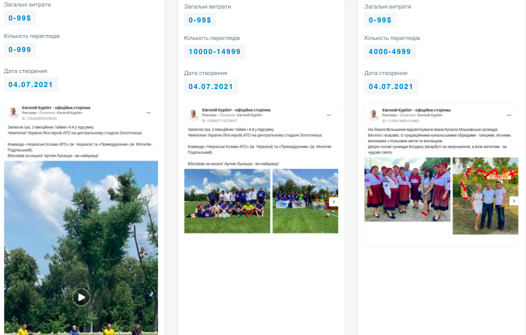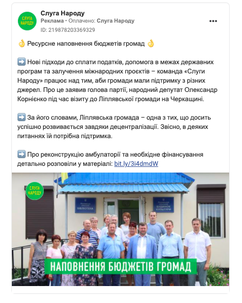 Окрім того сторінка партії “Слуга Народу” таргетувала на Черкащину промотований допис із новиною про візит голови партії, народного депутата Олександра Корнієнка до Ліплявської громади, котра входить до 197 ОВО. Загалом же офіційна сторінка партії за липень витратила на промоцію дописів 8049 $.