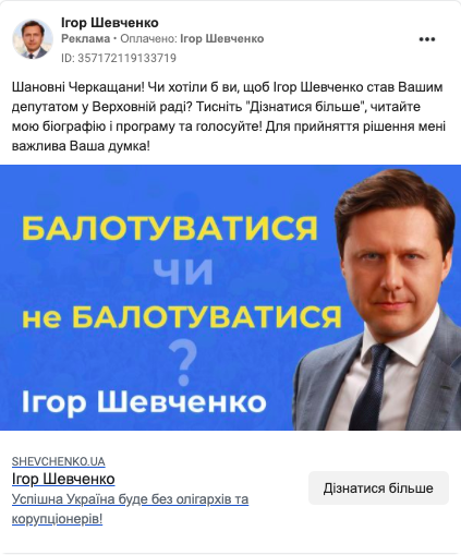 Лідер партії “Успішна Україна” Ігор Шевченко рекламу для дописів зі своєї сторінки у липні використовував тричі й витратив на це 348$. Однак лише був лише один промотований допис із таргетуванням безпосередньо на Черкащину. Допис містить посилання на сайт політика й запитання: балотуватися чи не балотуватися йому на проміжних виборах у 197 ОВО.