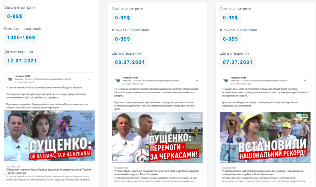 Промотовані дописи про діяльність чинного депутата Черкаської обласної ради від партії “Європейська солідарність”, потенційного кандидата на проміжних виборах у ОВО № 197 Романа Сущенка серед інших новин з’являються на сторінці “Черкаси NOW”. Зокрема, дописи із посиланнями на відео про його візити на округ, роботу в обласній раді тощо. Загалом же, у липні сторінка 22 рази використовувала платну рекламу, на що було витрачено 50$.