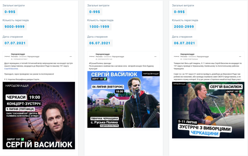 Представник партії “Народовладдя”, соліст гурту “Тінь Сонця” Сергій Василюк у зазначений період не використовував платне просування дописів зі своєї сторінки. Однак афіші концертів потенційного кандидата на окрузі п’ять разів промотували зі сторінки партії “Народовладдя” та тричі зі сторінки її очільника екснардепа Юрія Левченка. Загалом на всю рекламу (в тому числі й концертів Василюка), зі сторінки партії у липні витратили 90$, а на рекламу зі сторінки її очільника 148$.