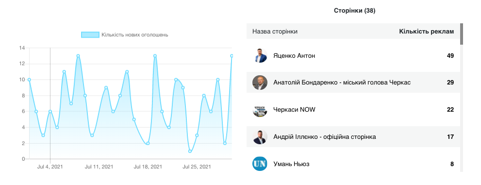 За період із 1 по 30 липня у Facebook з’явилось 197 рекламних дописів політичного характеру із таргетингом на Черкаську область понад 40% із 38 сторінок. Цільовою аудиторією більшості постів були жінки. Переважаючий віковий діапазон реципієнтів 25-64 років. Найменше, лише 1,5% переглядів, припало на чоловіків віком 18-24 років. Найбільше – 16,6% – на жінок віком 55-64 років.