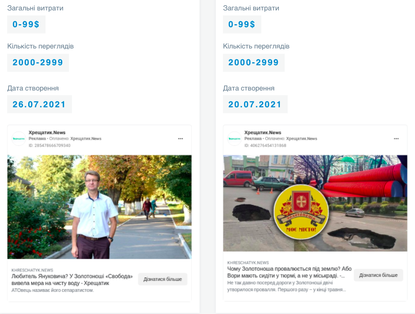 Також два промотованих дописи на Черкащину таргетувала новинна сторінка ХрещатикLive. Дописи містили посилання на статті із ознаками чорного піару проти міського голови Золотоноші Віталія Войцехівського, котрого, як заявив 27-го липня голова “Слуги Народу” Олександр Корнієнко, партія розглядає кандидатом від 197 ОВО. Загалом же у липні ця сторінка промотувала 96 дописів і витратили на це 144$. Цікаво, що раніше з цієї сторінки просували допис із посиланням на новинний портал “Хрещатик.News”, де був опублікований витяг із інтерв’ю Владислава Голуба з ознаками “джинси” одному зі всеукраїнських сайтів.