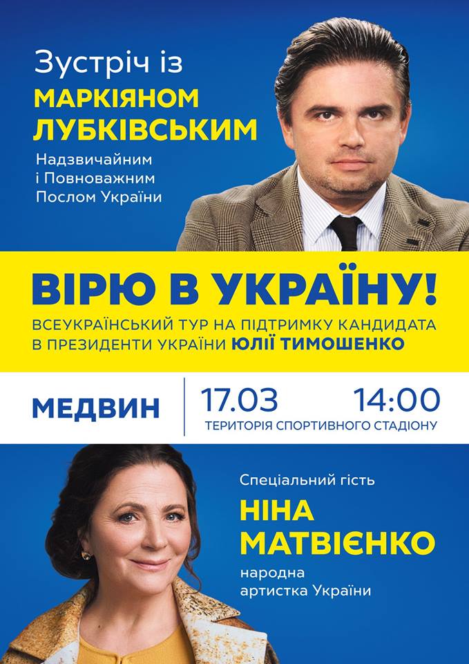 17 березня на Київщині пройшло одразу три заходи в рамках Всеукраїнського туру на підтримку кандидатки в Президенти Юлії Тимошенко «Вірю в Україну!». У Фастові та Обухові відбулися концерти за участю відомих музикантів, а у Медвині – зустріч із повноважним послом та народною артисткою. Про це повідомляють спостерігачі Громадянської мережі ОПОРА.