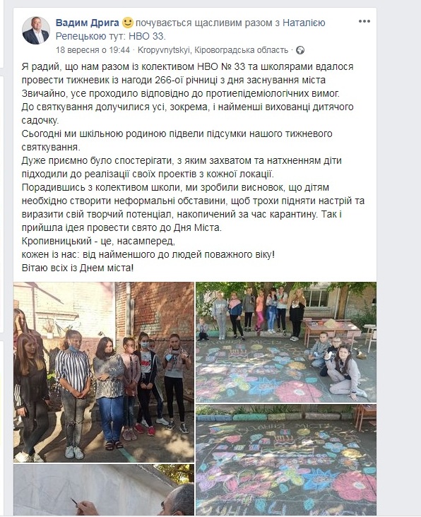 «Напередодні Дня міста, в цьому році в зв'язку з карантином ми відмовилися від масових заходів, але на протязі всього тижня проводимо тематичні заходи в ЗОШ НВО №33, присвячені Дню міста. Наприклад, сьогодні 15 вересня майстер клас з малювання провів знаний не тільки в нашому місті художник Вадим Медяник, житель Арнаутово. Спільно з майстром школярі розмалювали частину паркану школи, а потім продовжили малювати далі, змагаючись між своїми командами», – написав політик в соцмережах.