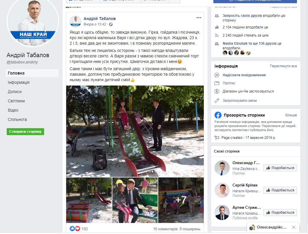 На вихідних секретар міськради Андрій Табалов зустрівся з мешканцями мікрорайону Жадова. Політик написав у соцмережах, що виконав обіцянку і змонтували гірку, гойдалку і пісочницю. Представники політика дітям організували свято з аніматорами. А на майданчику встановлені лавки з написом «З теплом та добром. Фонд Табалова».
