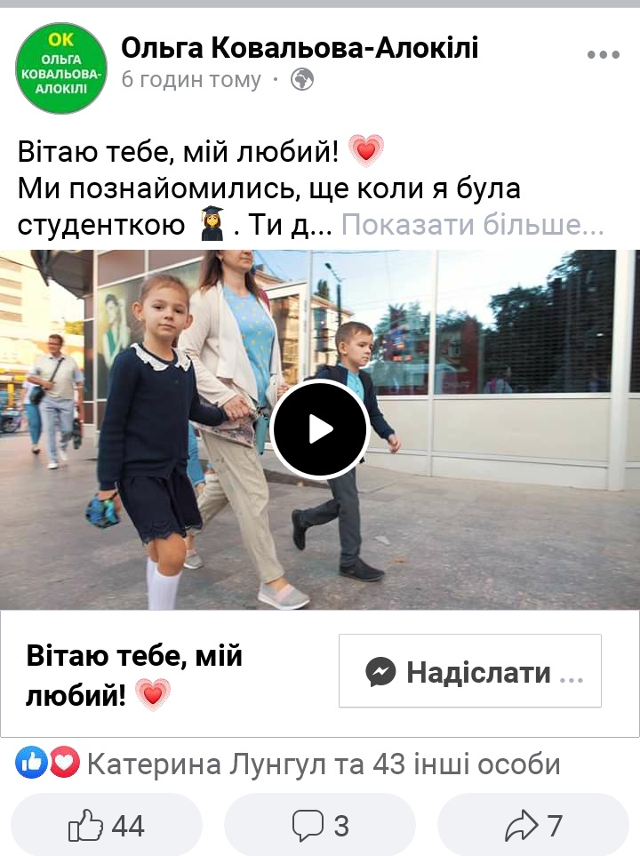 Ольга Ковальова-Альокілі зізналася, що познайомилася з Кропивницьким ще в студентські роки. У відеопривітанні використовують краєвиди міста та зазначено, що кандидатка планує «робити найкраще для міста».